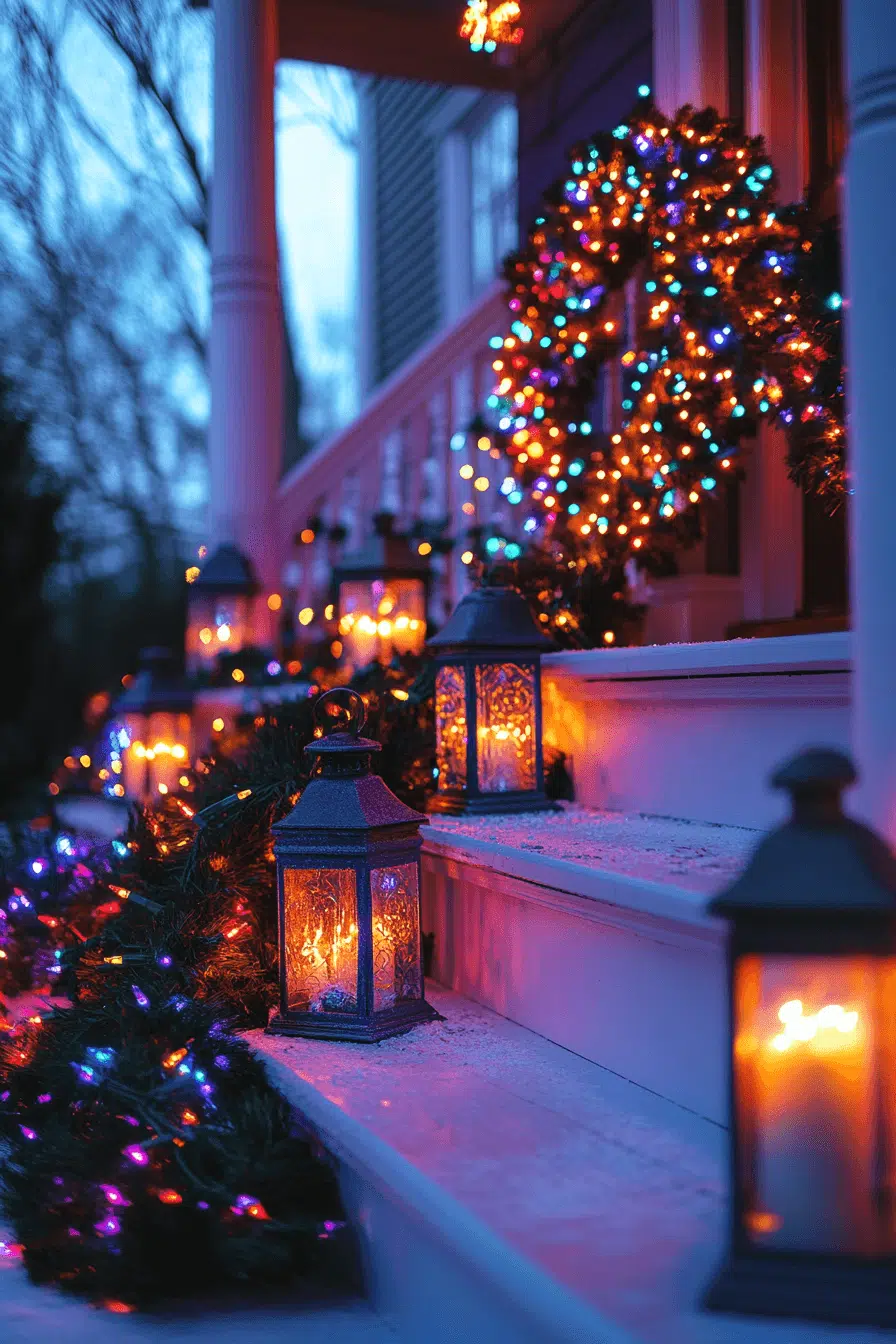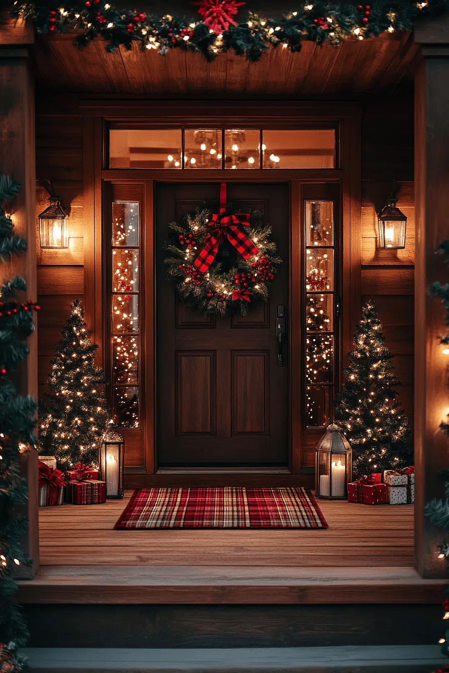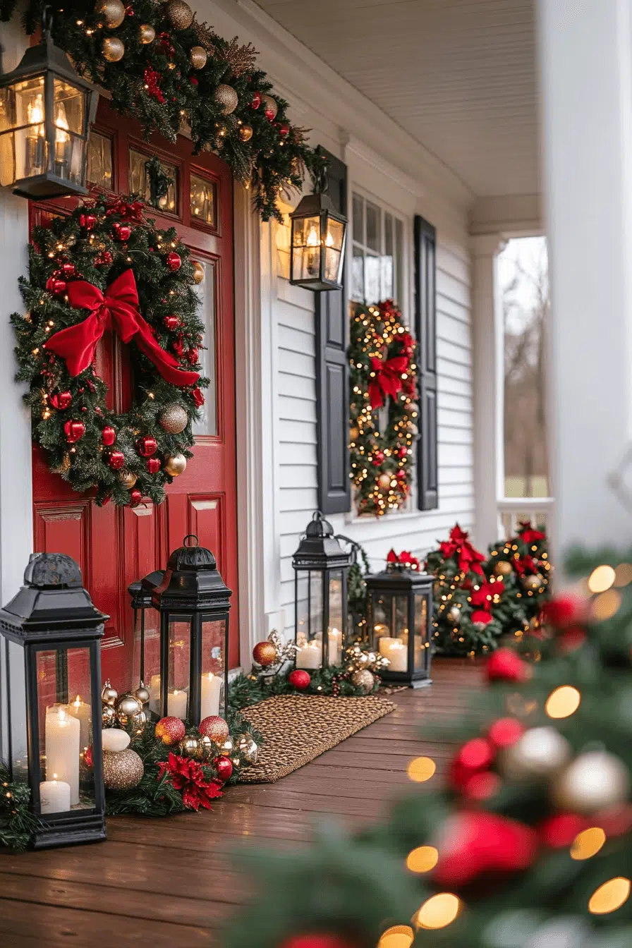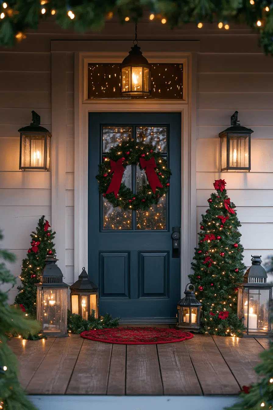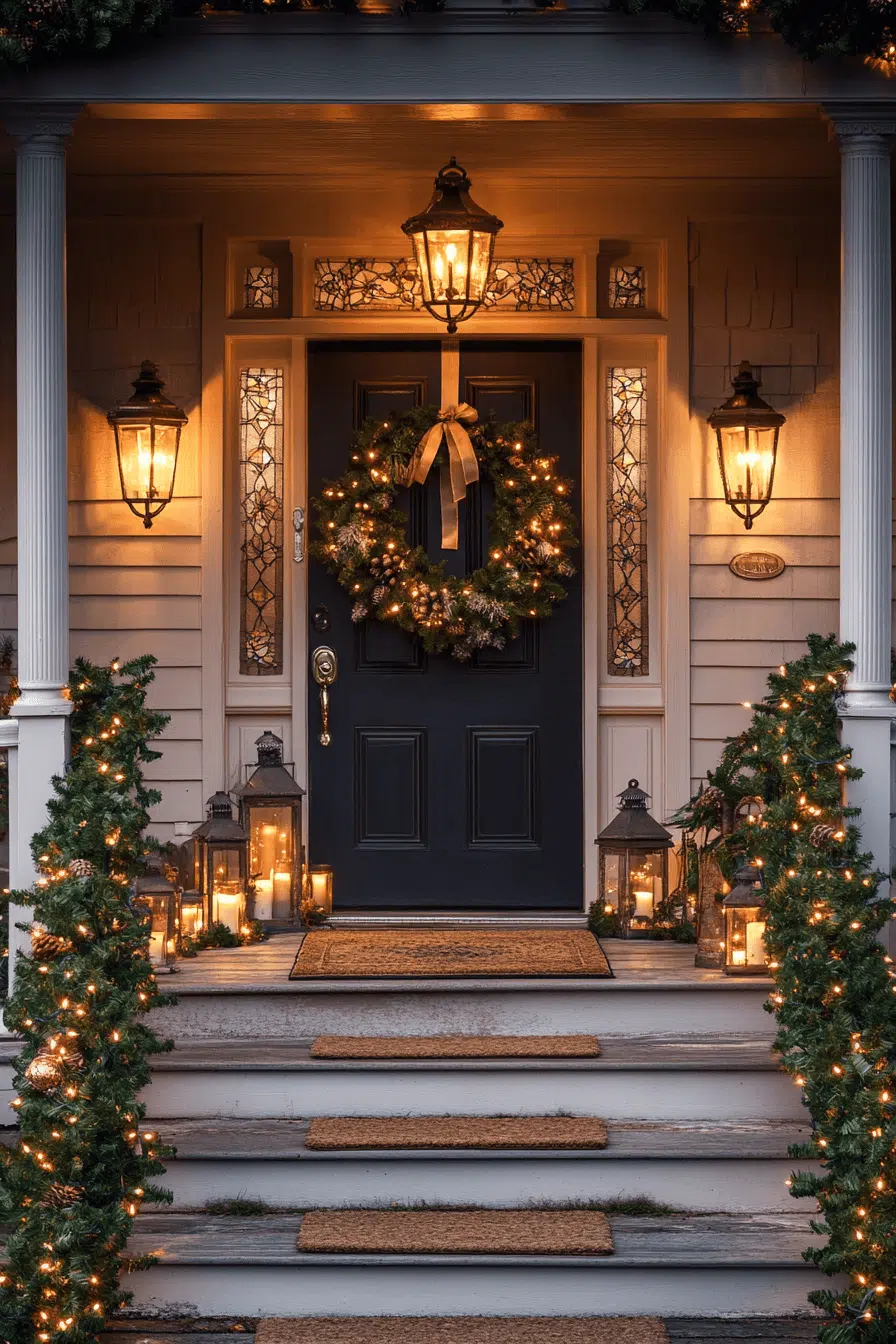 Wrap your doorway in golden warmth with front porch Christmas decor built around soft light. Layer amber lanterns, woven textures, and glowing bulbs for a sense of hearth and heart. The effect feels cozy yet radiant.