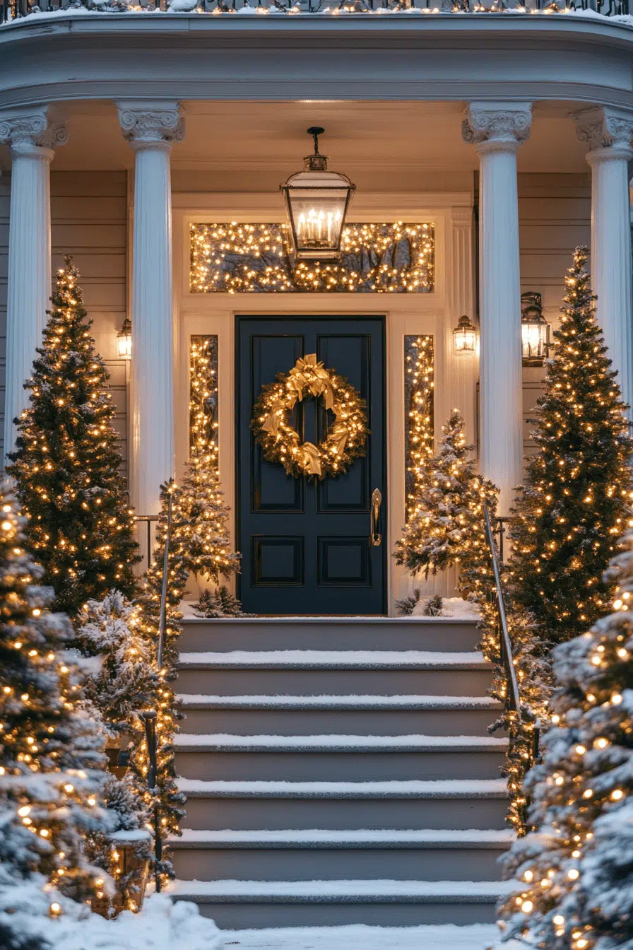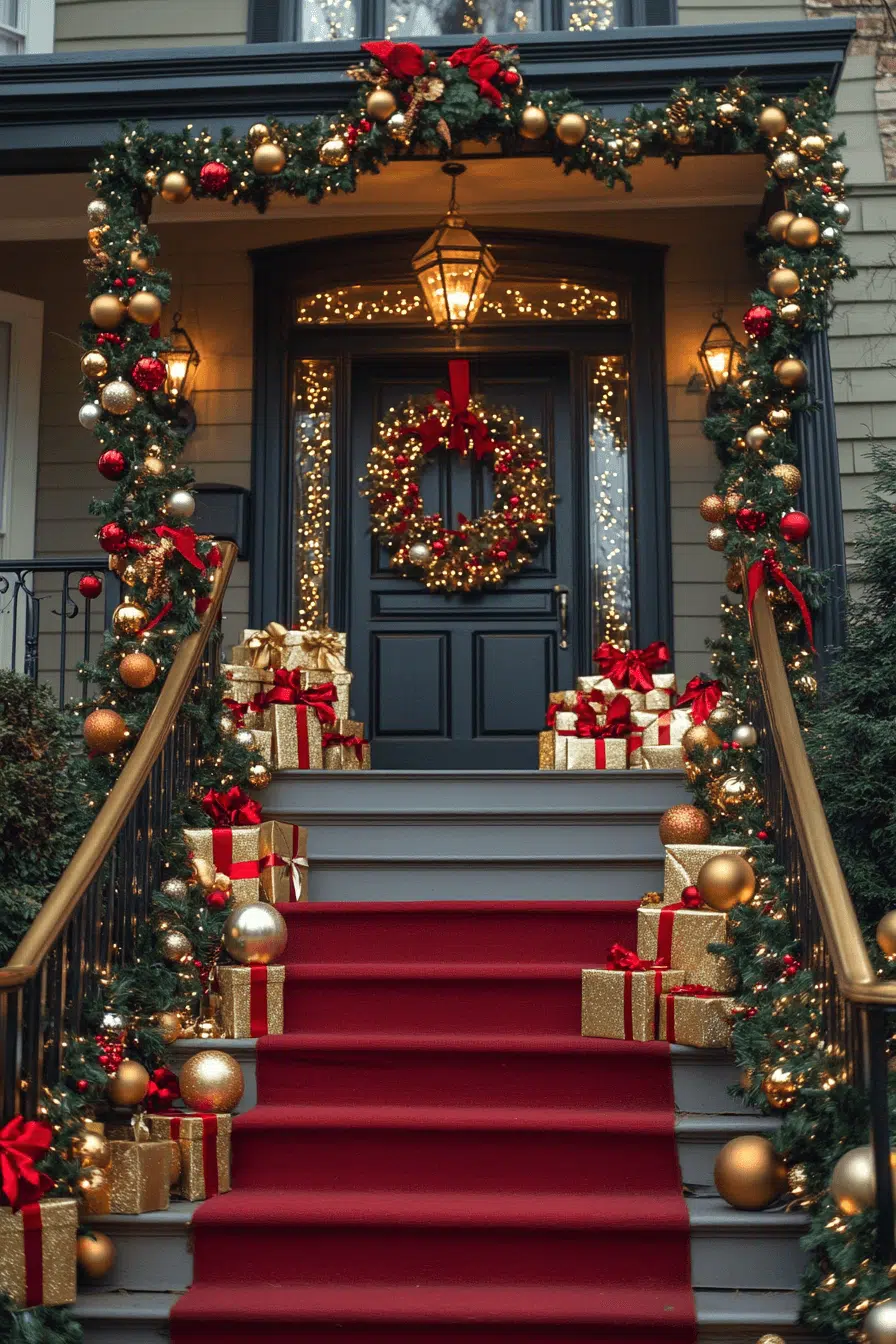 Illuminate your nights with front porch Christmas decor that transforms your home into a glowing landmark. String fairy lights along pillars, outline the roofline, and frame the doorway in a halo of gold. A touch of reflective metallic brings dimension. The result is magical and radiant.