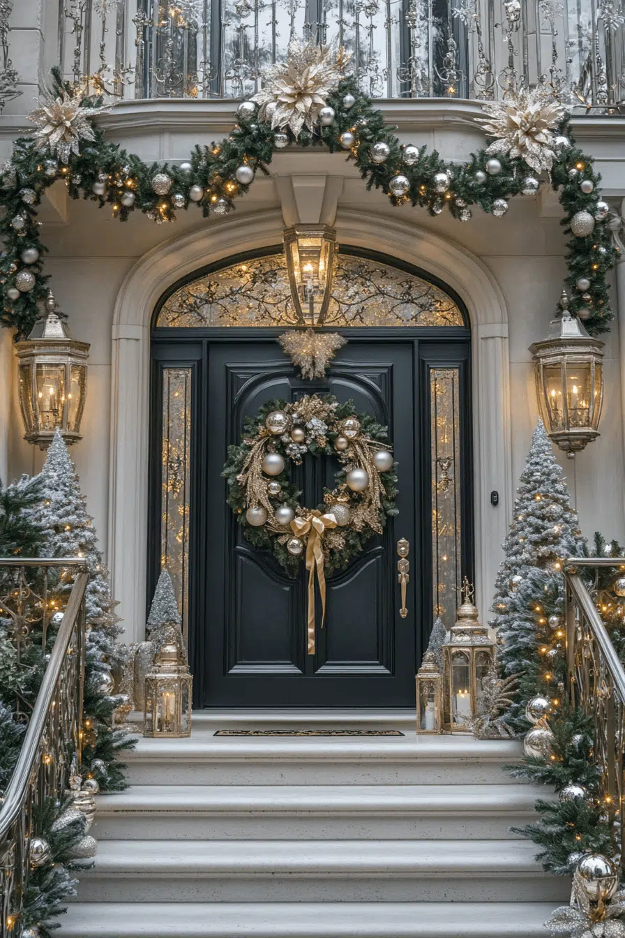 Elevate your curb appeal with front porch Christmas decor that feels effortlessly refined. Golden ribbons, satin bows, and crystal accents shimmer under the evening sky. A symmetrical arrangement of planters and candles adds a touch of grandeur. The result is both polished and inviting.
