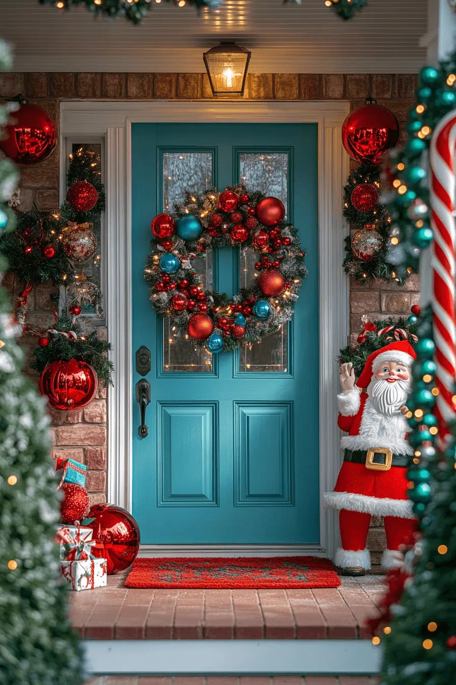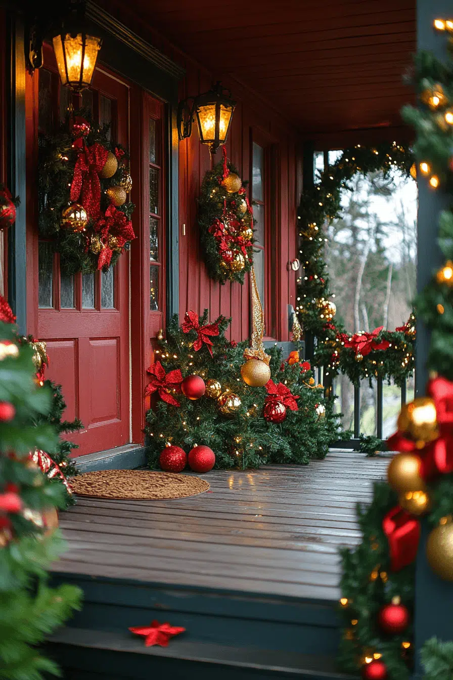 Spread cheer with front porch Christmas decor designed for big smiles. Red ribbons, gold bells, and glittering signs announce celebration from every corner. The look is vibrant, playful, and full of movement.