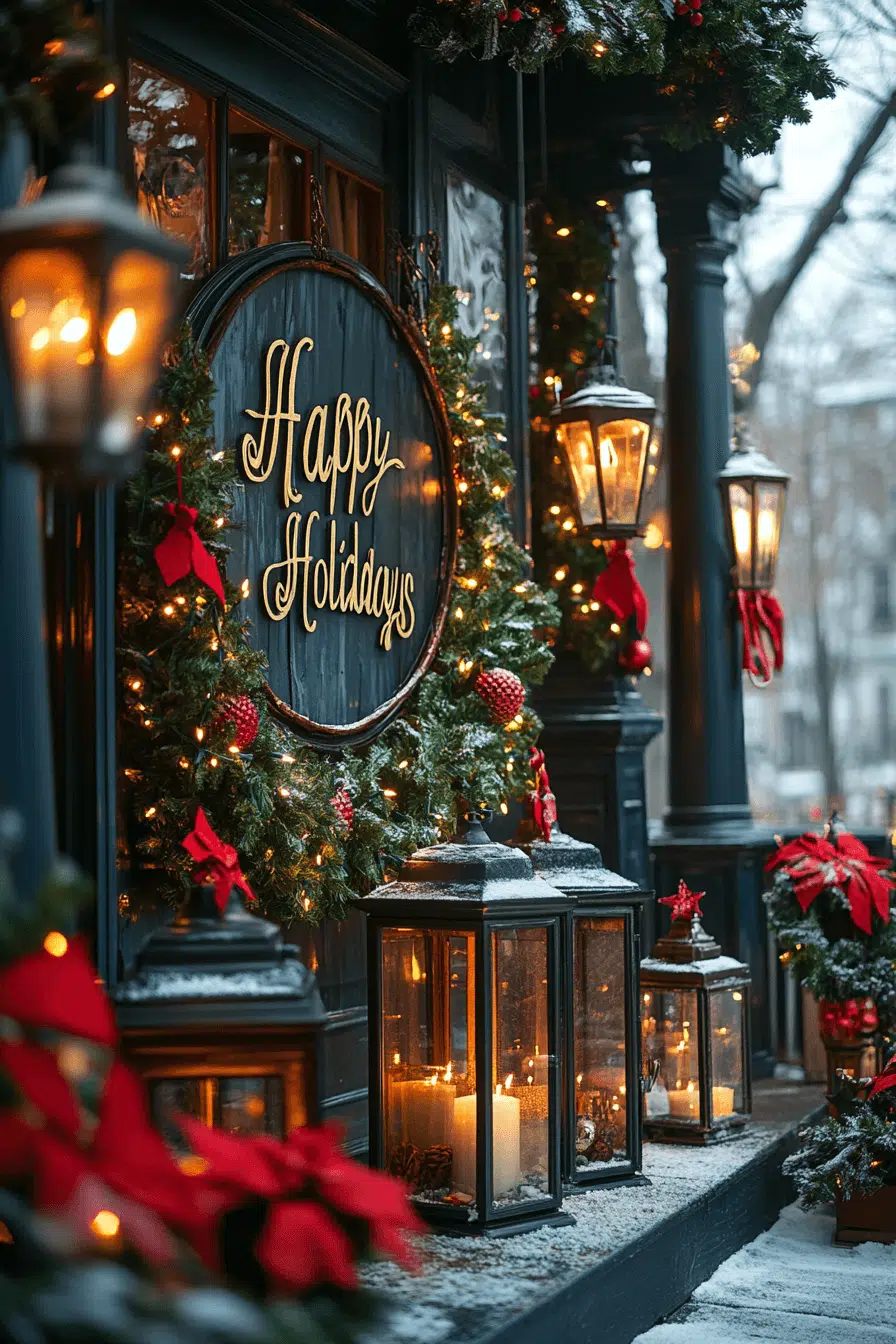 Make light the star of your exterior with front porch Christmas decor that sparkles from every angle. Wrap garlands in twinkling bulbs and hang luminous snowflakes above the doorway. Layer candles in clear lanterns for soft, radiant depth. The glow feels joyful yet sophisticated.