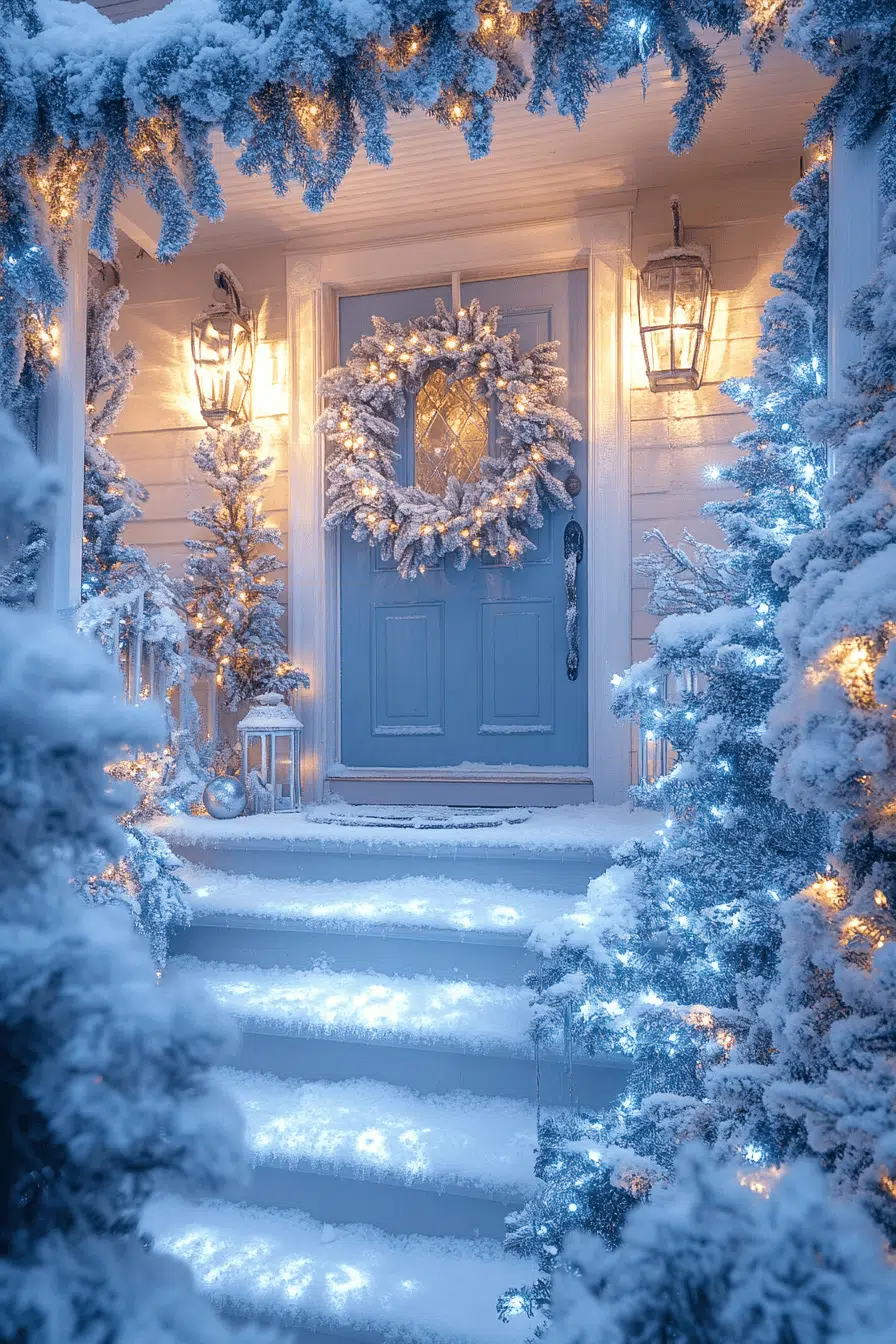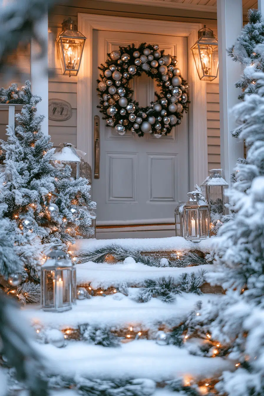 Transform your home’s entrance into a luminous masterpiece with front porch Christmas decor that gleams like morning frost. Layer icy garlands, crystal ornaments, and glistening snowflake lights to capture the stillness of a winter morning. Soft silver tones meet the warmth of candlelight for a serene balance of cool and cozy. Every sparkle feels intentional and chic.