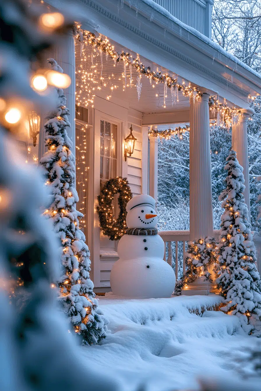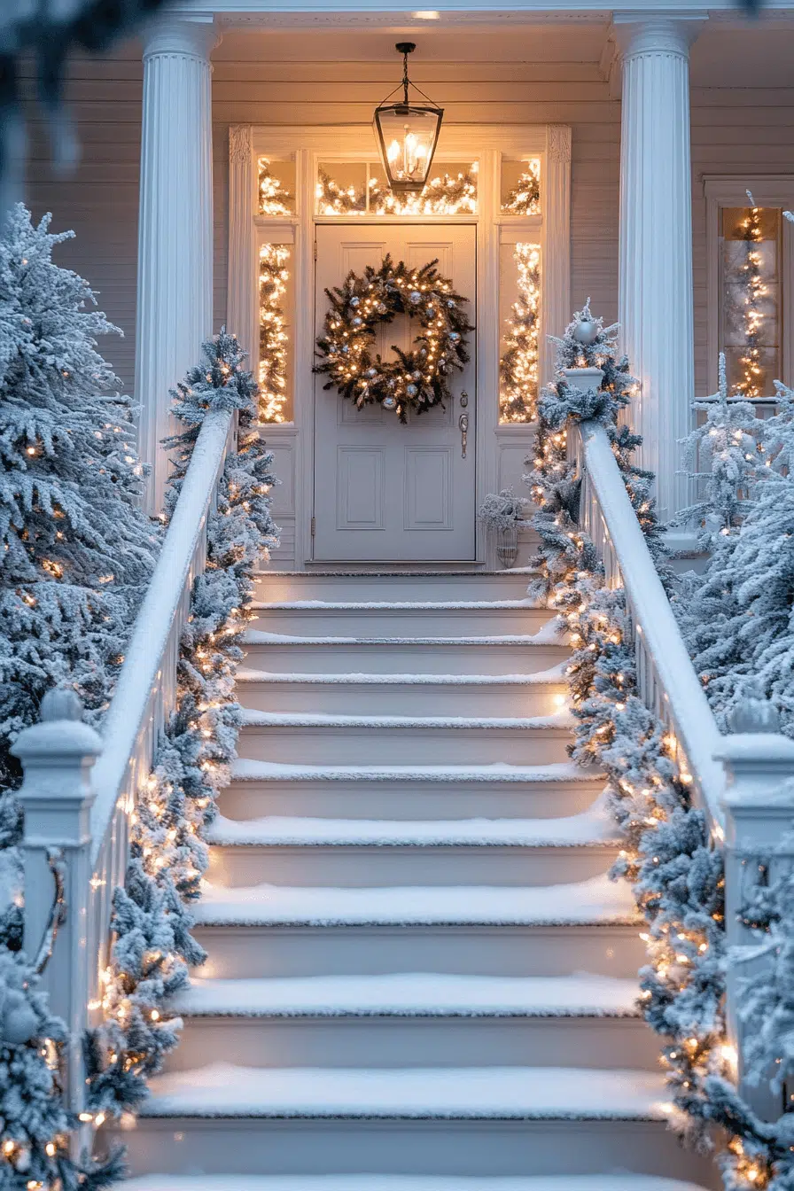 Capture the elegance of snowfall with front porch Christmas decor inspired by frosted woods and pale moonlight. Drape your railing in white garlands and icy ornaments, accented by silver bows. Gentle lighting reflects across every snow-touched surface, creating instant enchantment. It’s refined, calming, and full of holiday magic.