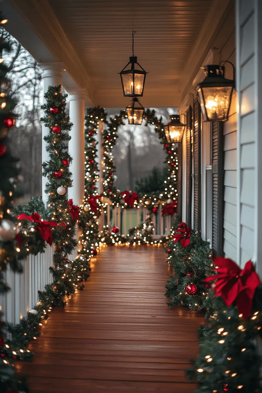 Frame your doorway in abundant greenery with front porch Christmas decor that celebrates lush garlands. Layer pine branches with shimmering ornaments and ribbons for elegant dimension. The texture and color invite warmth into every photo. It’s holiday tradition reimagined.