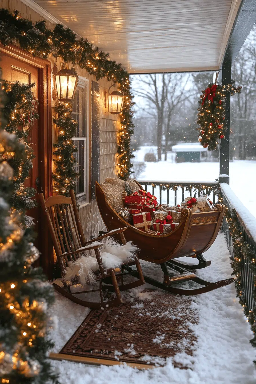 Infuse nostalgia into your home with front porch Christmas decor featuring sleighs, pine garlands, and glowing lanterns. The mix feels vintage yet joyful, full of storybook warmth. Add faux snow for whimsy.