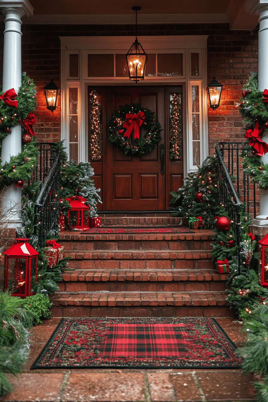 Celebrate timeless tradition with front porch Christmas decor steeped in red and green. Twine plaid ribbons through evergreens and tie bright bows around lanterns for nostalgic cheer. A bold wreath adds a finishing touch of heritage charm. Every element feels rich with history and heart.