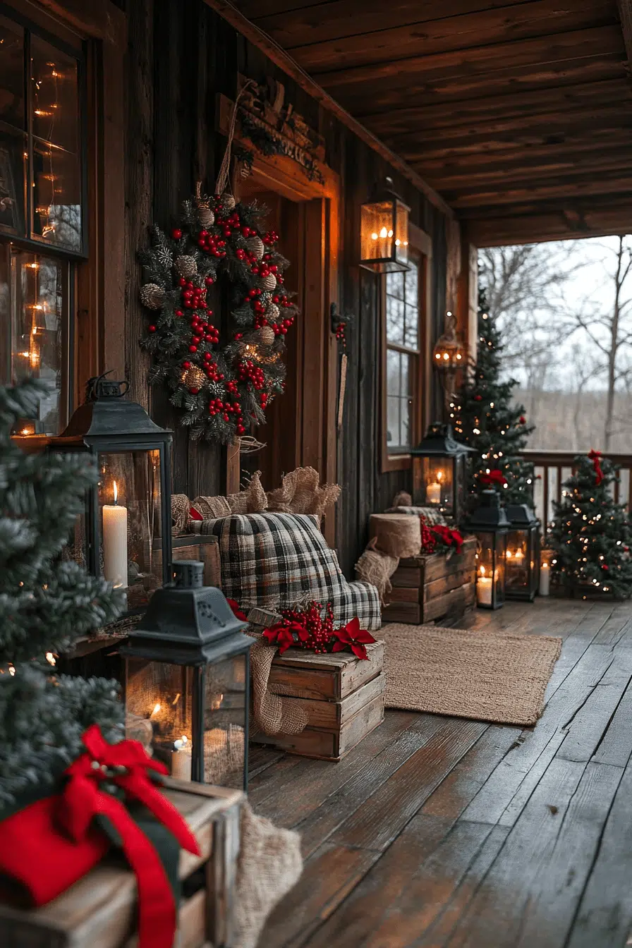 Welcome guests in cozy sophistication with front porch Christmas decor designed for comfort and charm. Plush outdoor seating, flickering lanterns, and twinkling lights make the space glow. Add evergreen wreaths to balance warmth and structure.
