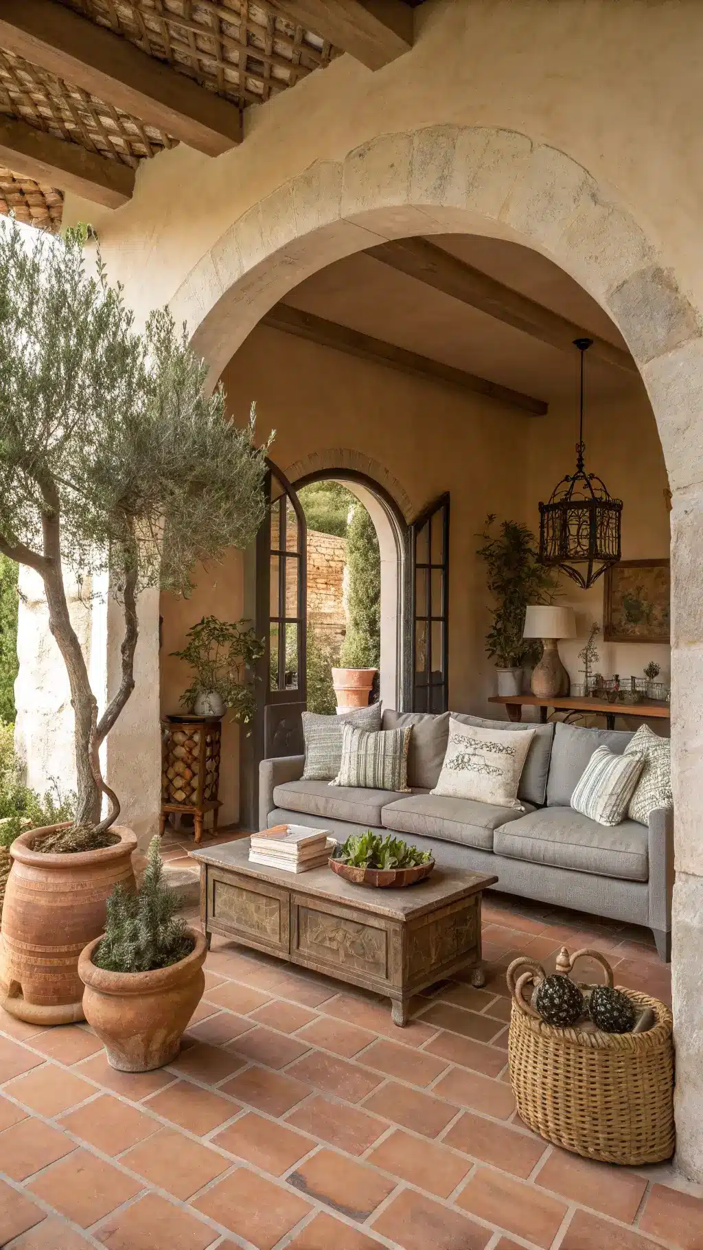 Light-filled Bohemian retreat with white wooden beams, dove grey velvet sofa, woven rattan chairs, vintage brass tables, and a bleached jute rug. The room is adorned with ceramic vases holding pampas grass and textured throw pillows in sand, ivory and pale blue tones.