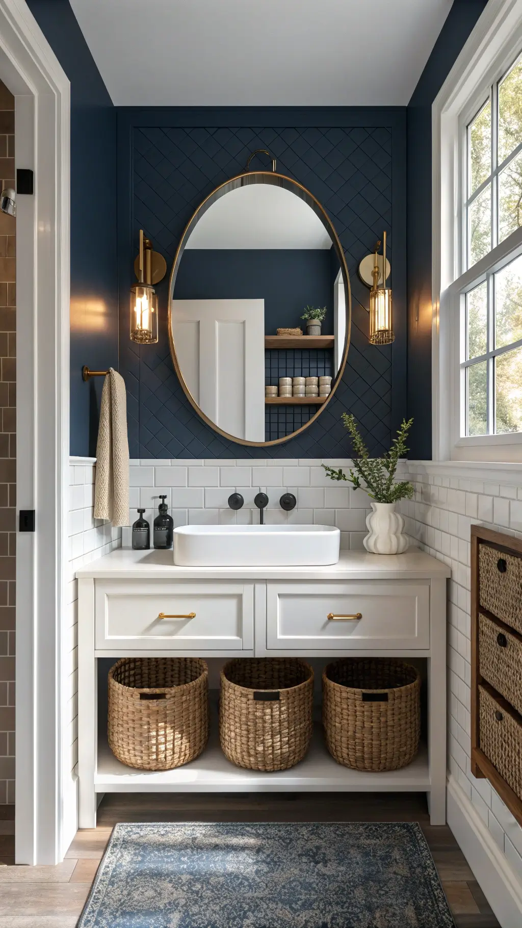 I painted my half bath walls a deep navy blue, and it went from builder-grade boring to sophisticated in literally one afternoon.
