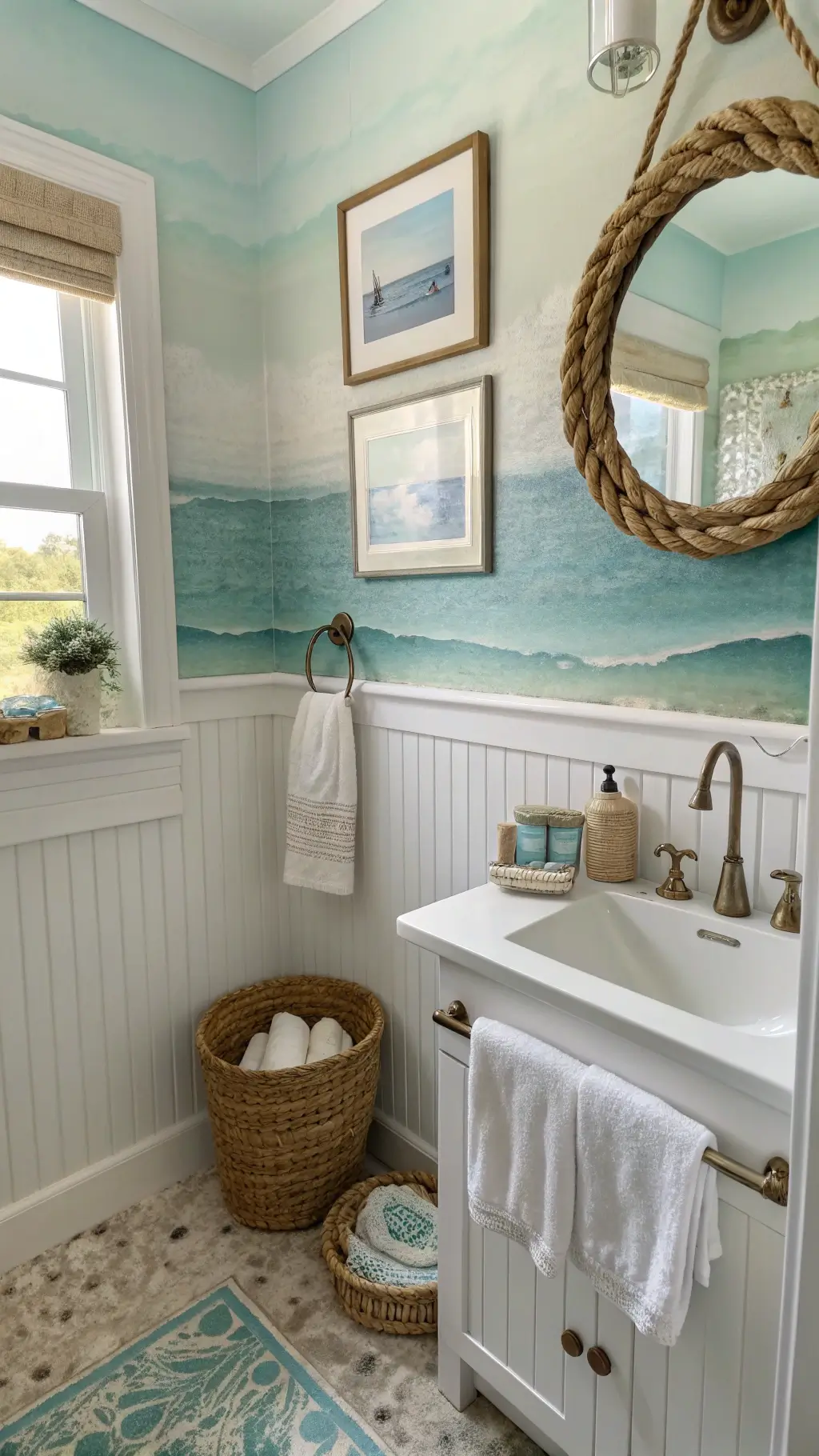 Light blues, whites, maybe some rope details in your mirror frame or shelving.