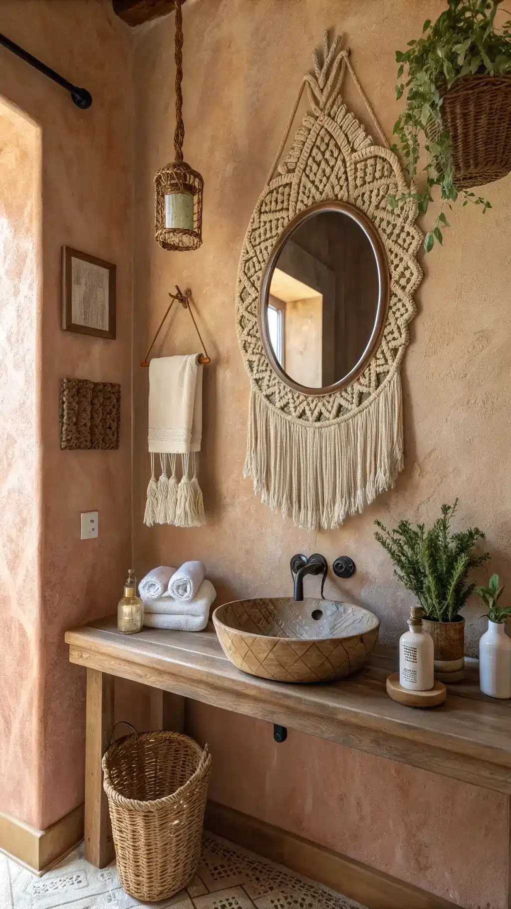 This is where you can get creative without spending much. I combined smooth subway tiles behind my sink with a textured bath mat and some woven baskets for storage.