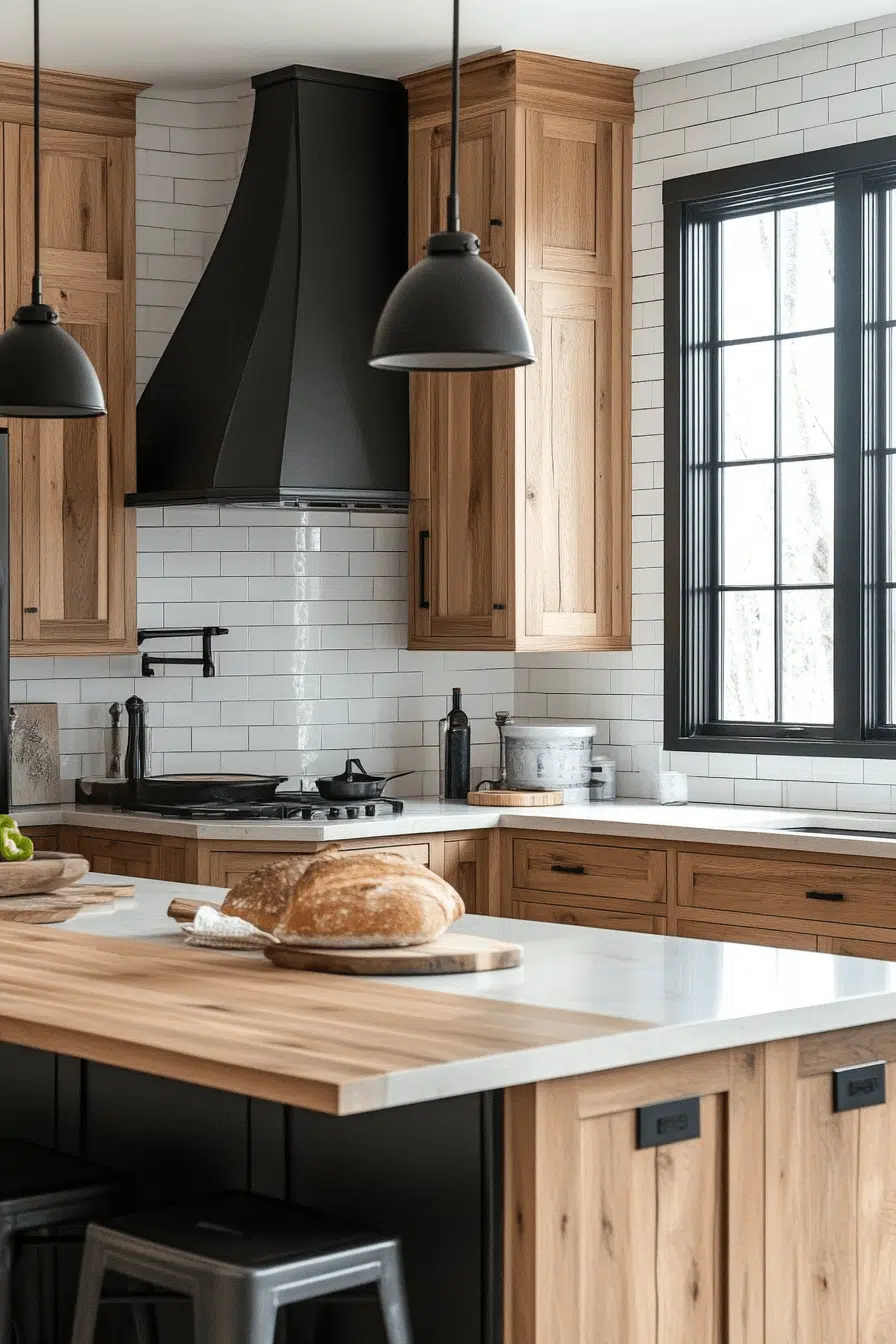 Black accents add contrast and definition to hickory kitchen cabinets. Hardware, faucets, and lighting stand out against the warm wood tones. This pairing introduces a modern edge while maintaining natural warmth. The contrast feels clean, bold, and stylish. These hickory kitchen cabinets take on a contemporary look with dark details. Explore how black accents can elevate your kitchen design.