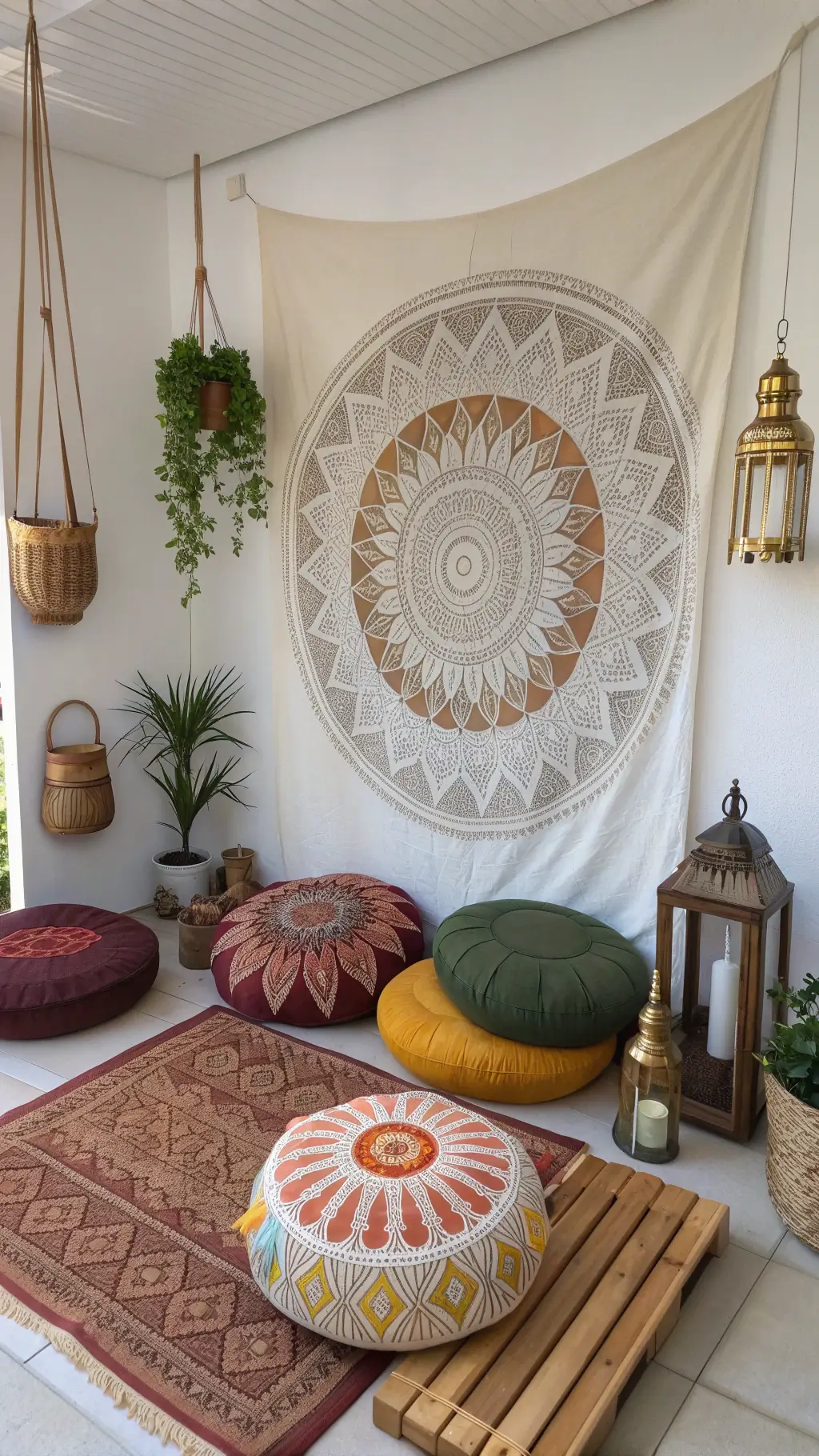 Throw pillows, outdoor rugs, and tapestries turn hard surfaces into cozy nests.