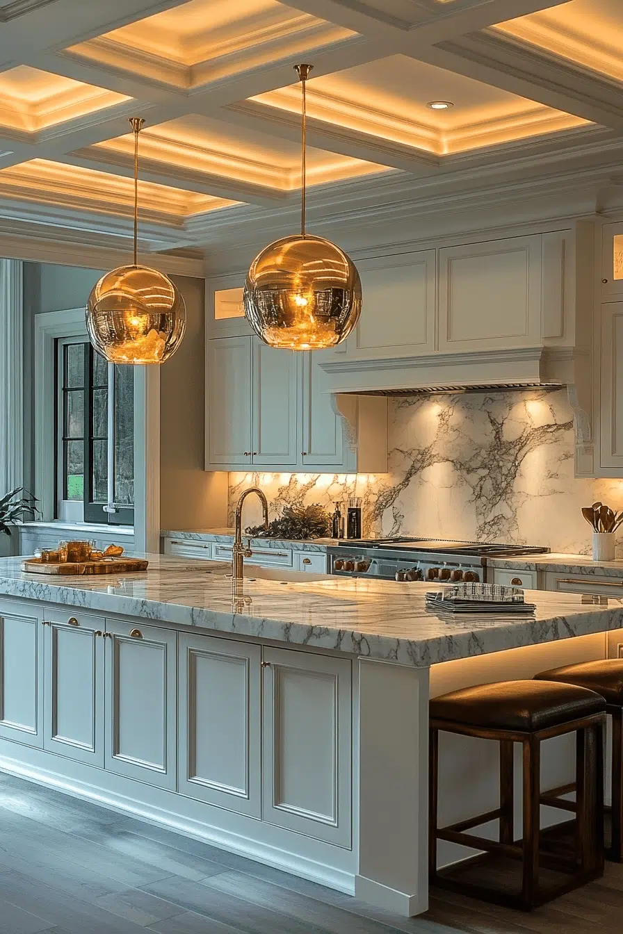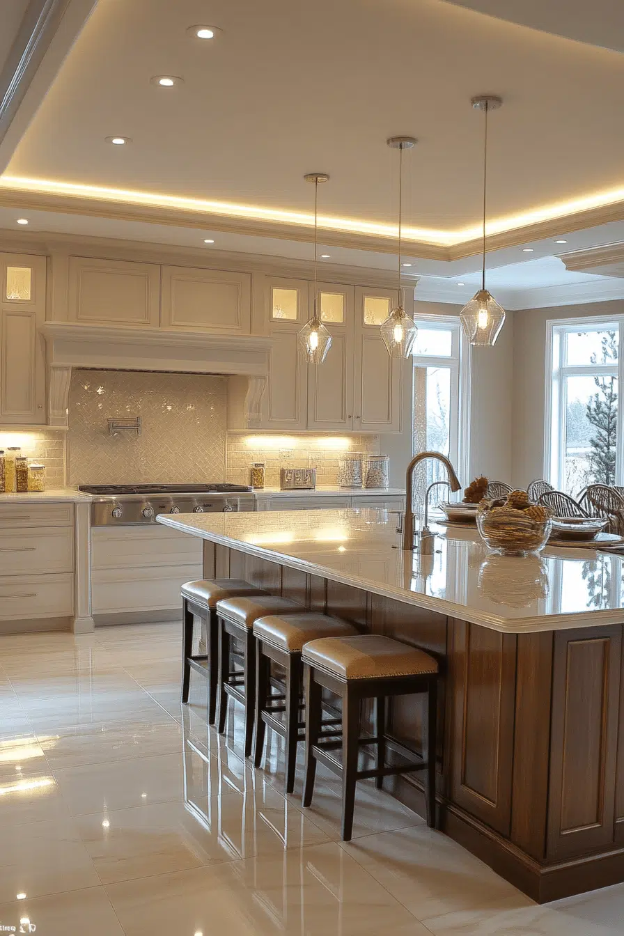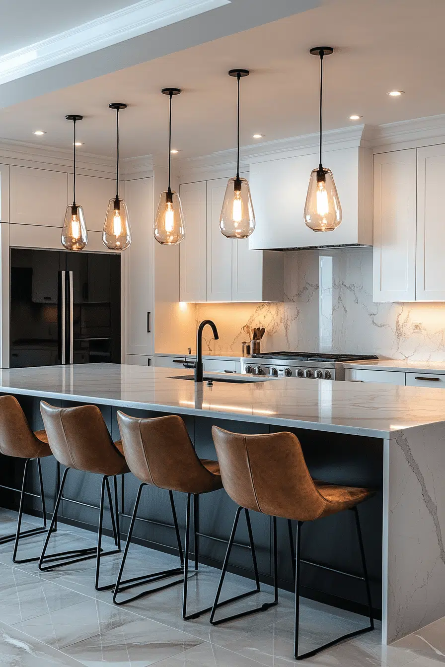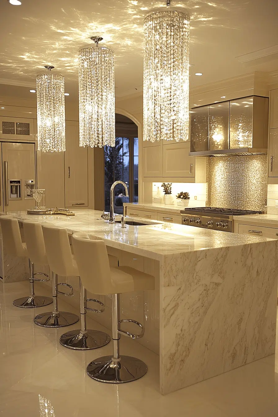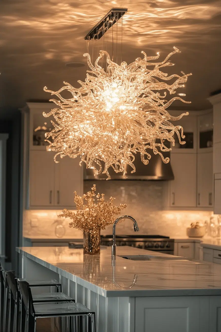 Glass chandeliers bring radiant elegance to luxurious kitchen lighting ideas. Their reflective surfaces amplify light beautifully. These kitchen lighting ideas create a stunning focal point. They enhance both contemporary and classic designs. The space feels bright and sophisticated. Transform your kitchen with kitchen lighting ideas that shine with glass brilliance!