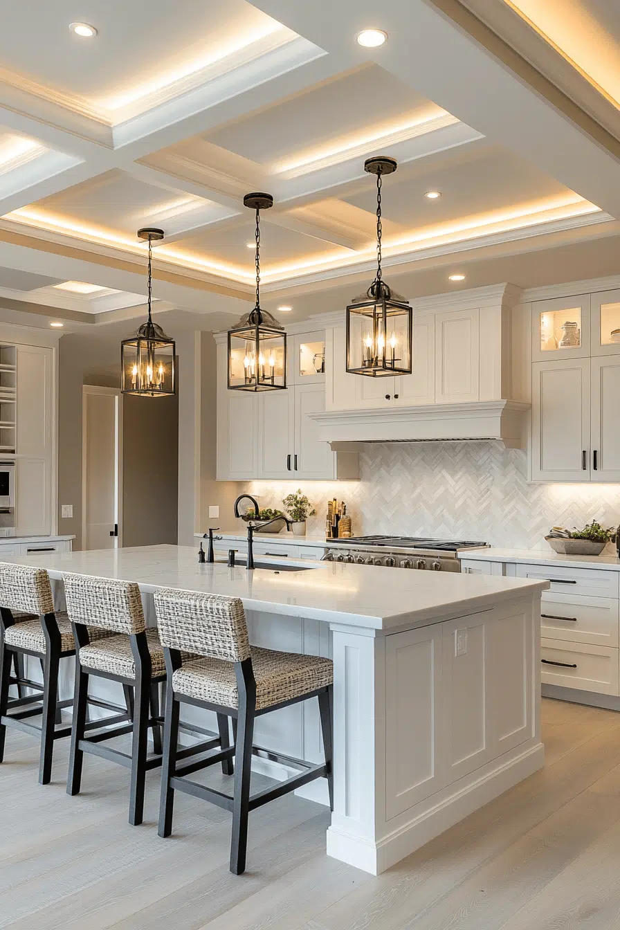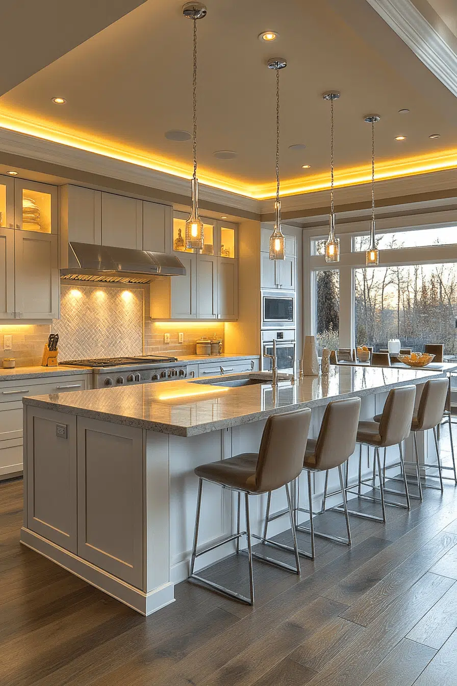 Cove lighting introduces elegance into refined kitchen lighting ideas with soft, indirect glow. Light reflects gently across walls and ceilings, creating depth. These kitchen lighting ideas highlight architectural details beautifully. They work especially well in modern kitchens. The atmosphere feels calm and sophisticated. Elevate your space with kitchen lighting ideas that glow with subtle luxury!