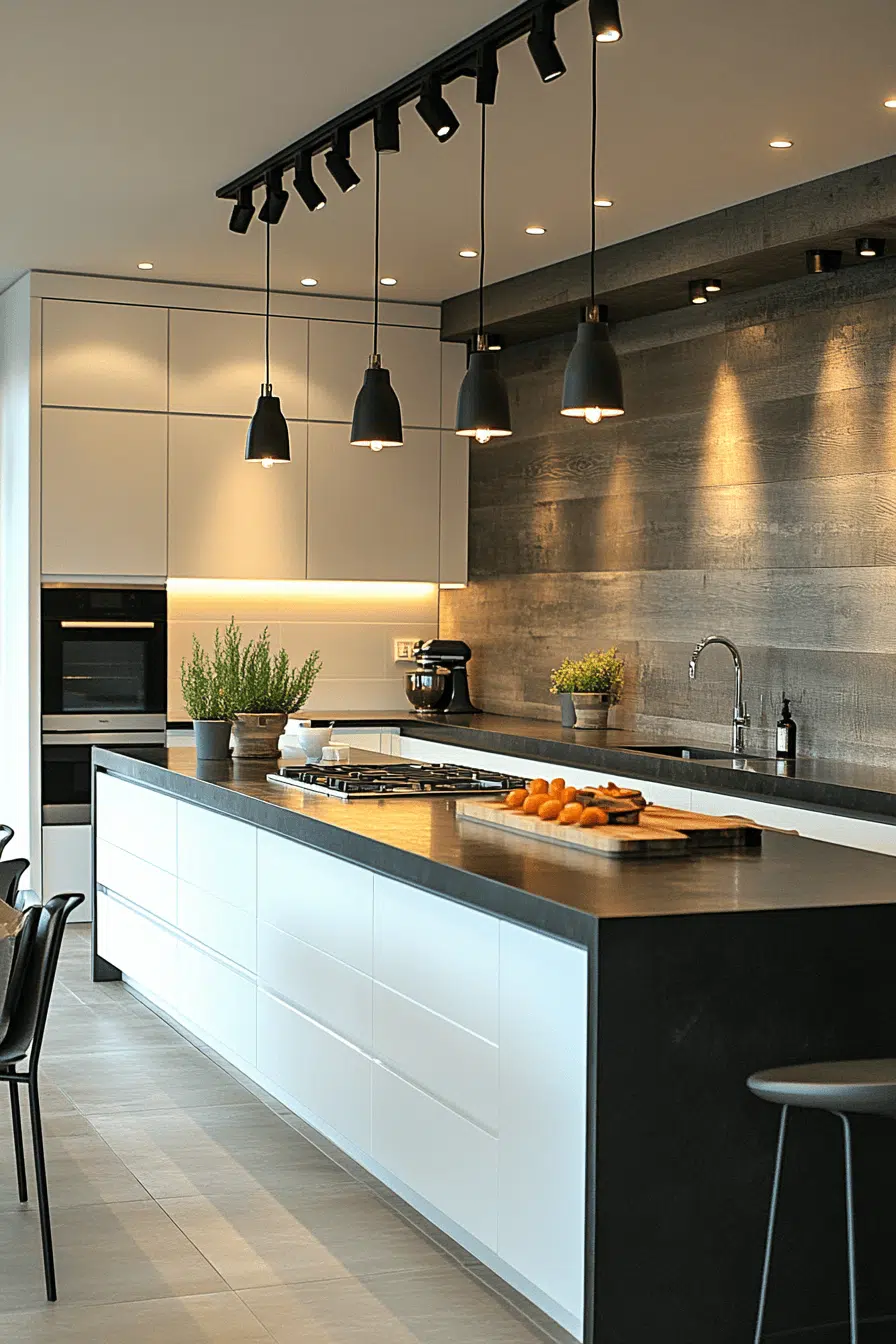 Track lighting offers flexibility in adaptable kitchen lighting ideas for modern homes. Adjustable heads allow you to direct light across different areas. These kitchen lighting ideas work well in open layouts with changing needs. They provide broad coverage without clutter. The streamlined design keeps the ceiling clean. Discover kitchen lighting ideas that move with your lifestyle!