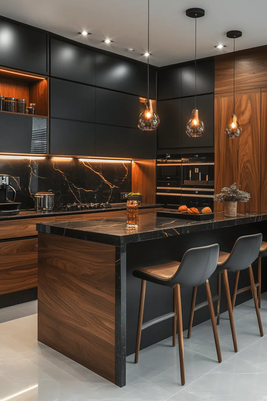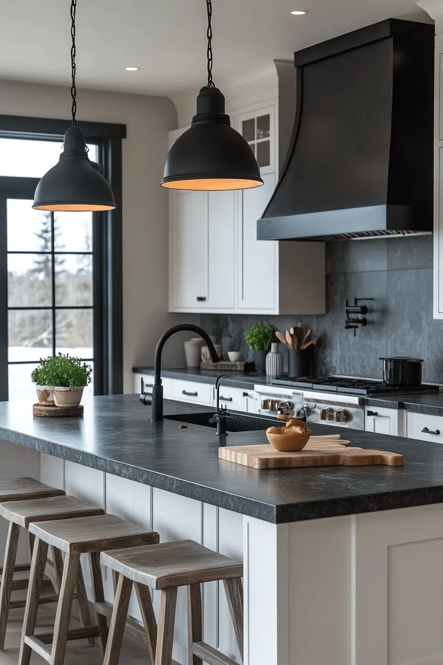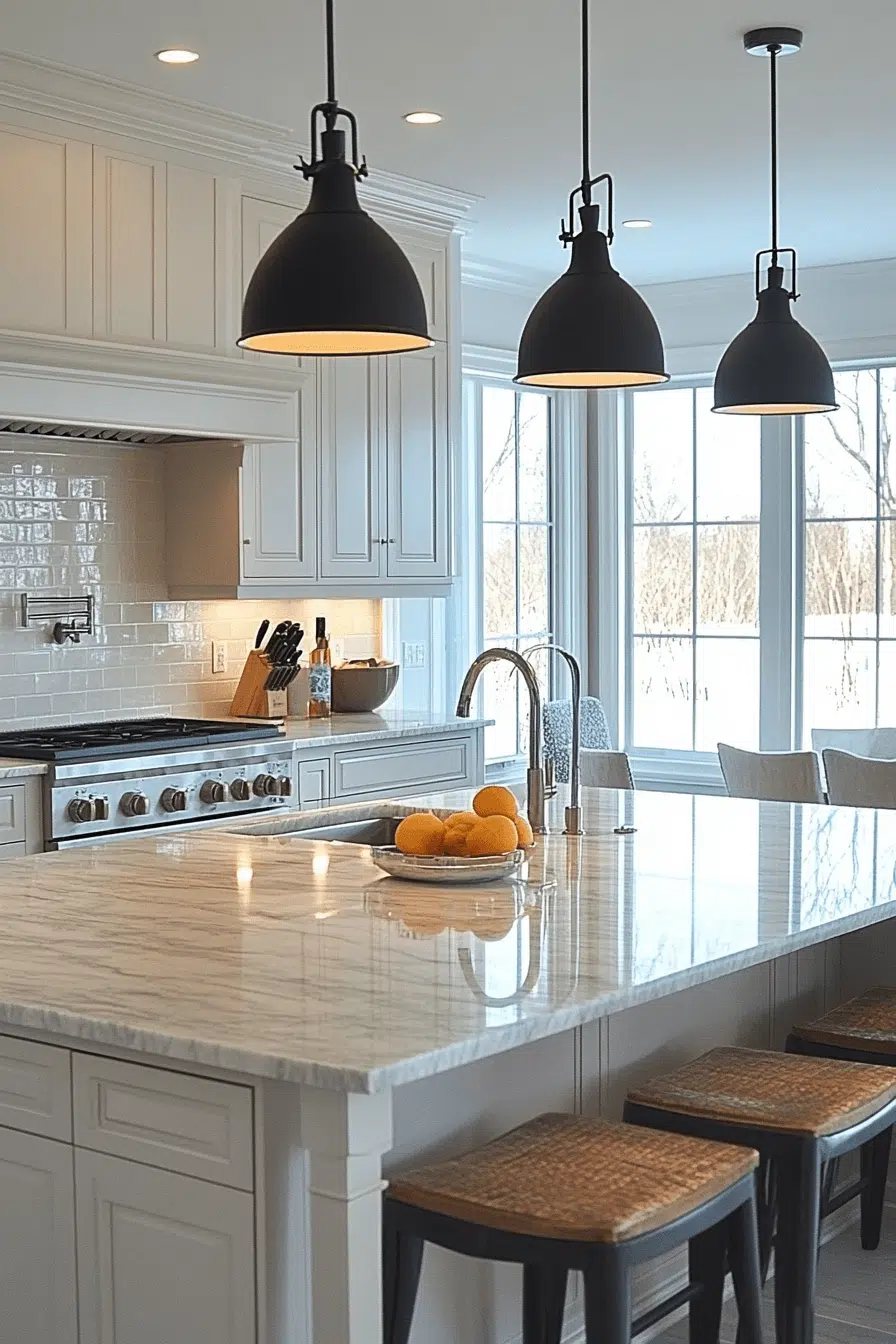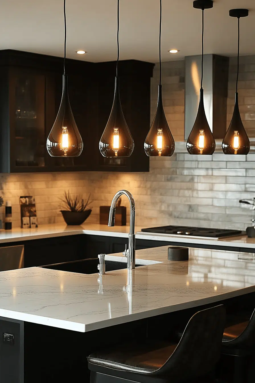 Black fixtures add bold contrast to stylish kitchen lighting ideas. Against light backgrounds, they create a striking visual statement. These kitchen lighting ideas complement modern and industrial styles. They ground the design while adding depth. Coordinated accents complete the look. Create contrast with kitchen lighting ideas that stand out beautifully!