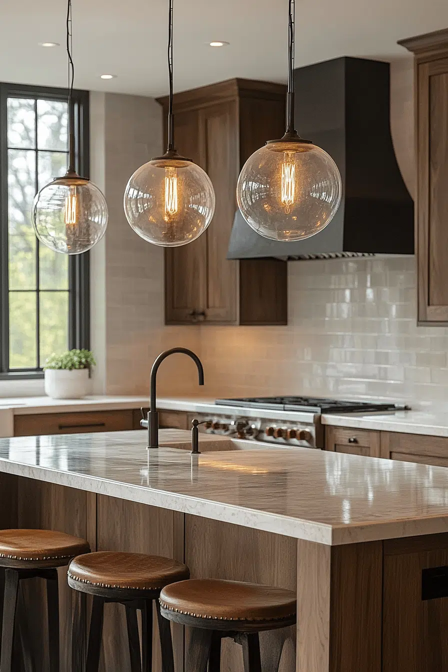 Globe fixtures introduce playful charm into creative kitchen lighting ideas. Their rounded shapes cast soft, even light across the space. These kitchen lighting ideas work as both focal points and subtle accents. Grouping them adds visual interest. The design feels both vintage and modern. Add character with kitchen lighting ideas that feel timeless and fun!