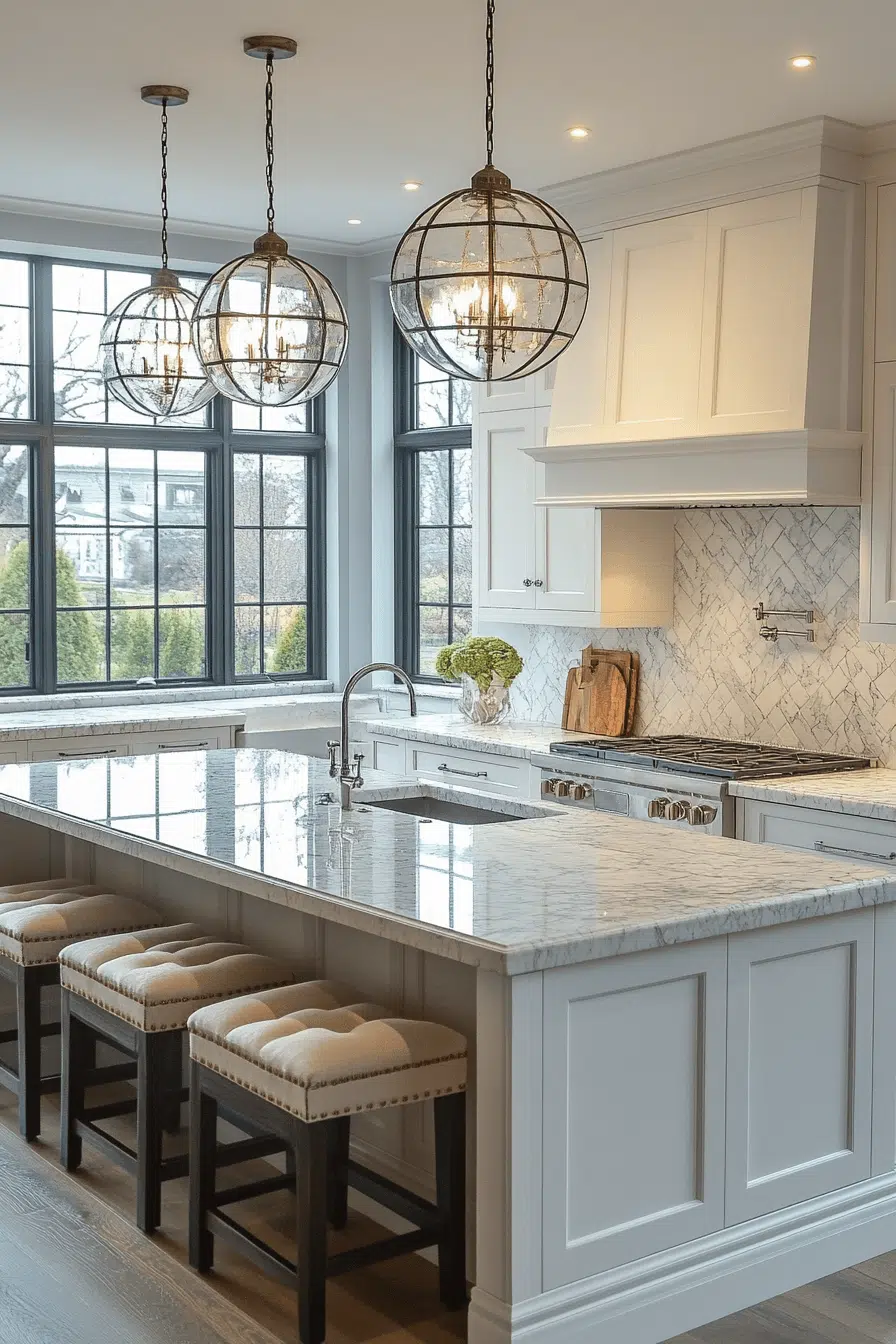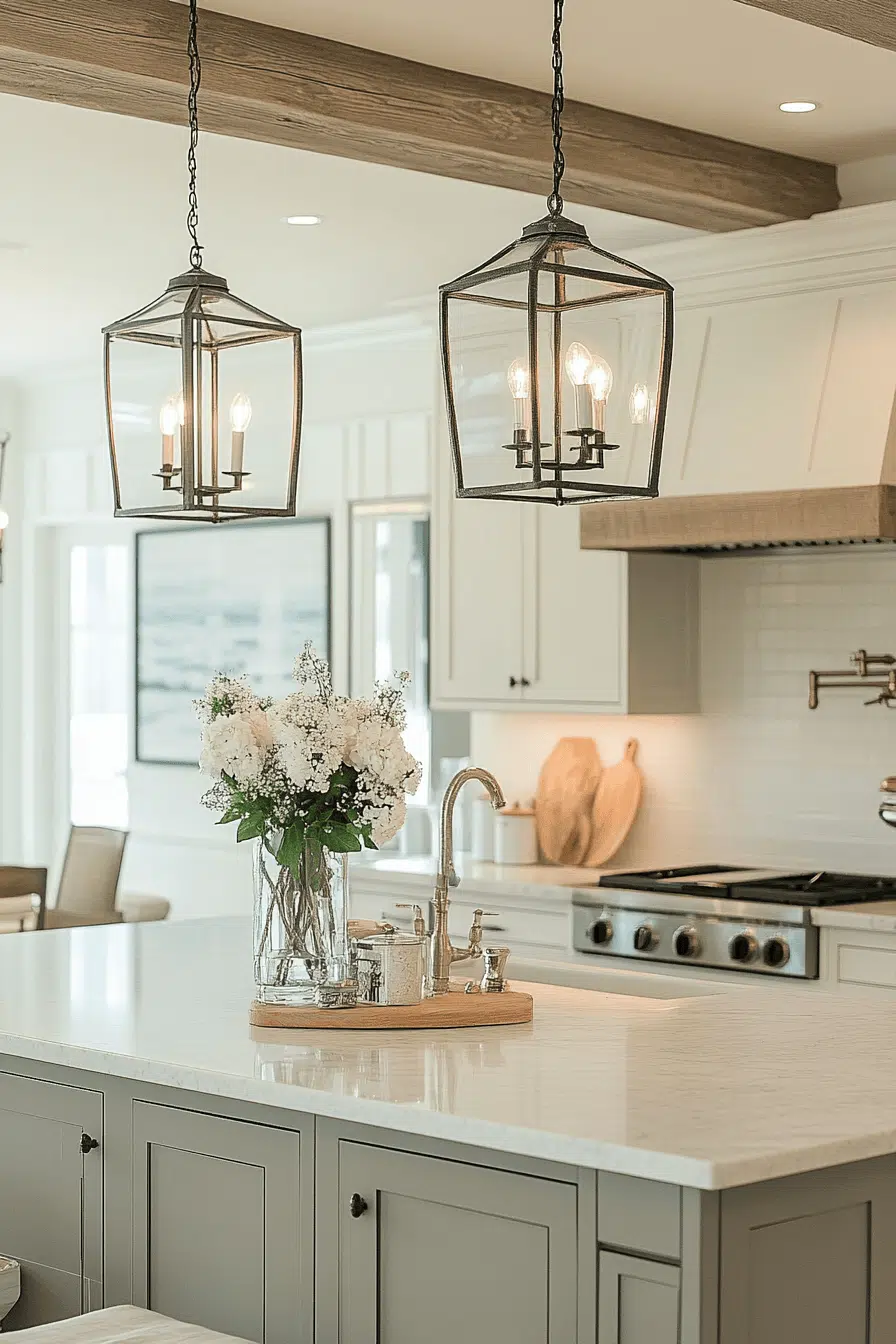 Coastal lanterns bring a breezy feel to refreshing kitchen lighting ideas. Their airy design allows light to flow freely. These kitchen lighting ideas pair well with natural textures and soft colors. The atmosphere feels calm and relaxed. The space reflects coastal charm effortlessly. Bring seaside vibes home with kitchen lighting ideas that feel light and airy!
