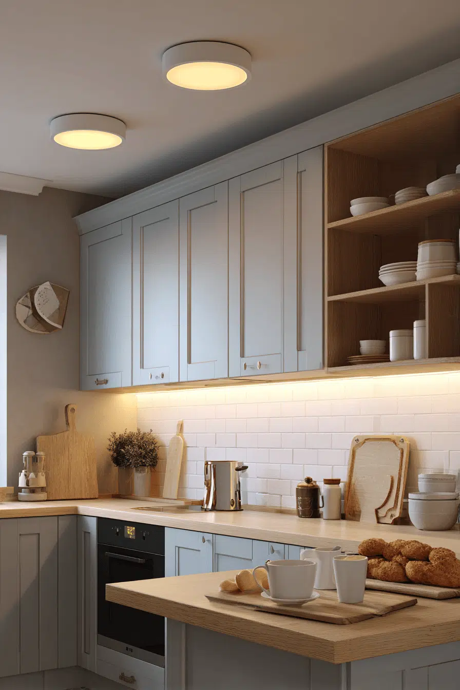 Halo ceiling lights create a soft, modern glow in contemporary kitchen lighting ideas. Their circular design spreads light evenly throughout the room. These kitchen lighting ideas feel calm and balanced. They pair perfectly with minimalist interiors. The result is clean and serene. Discover kitchen lighting ideas that create a peaceful glow!