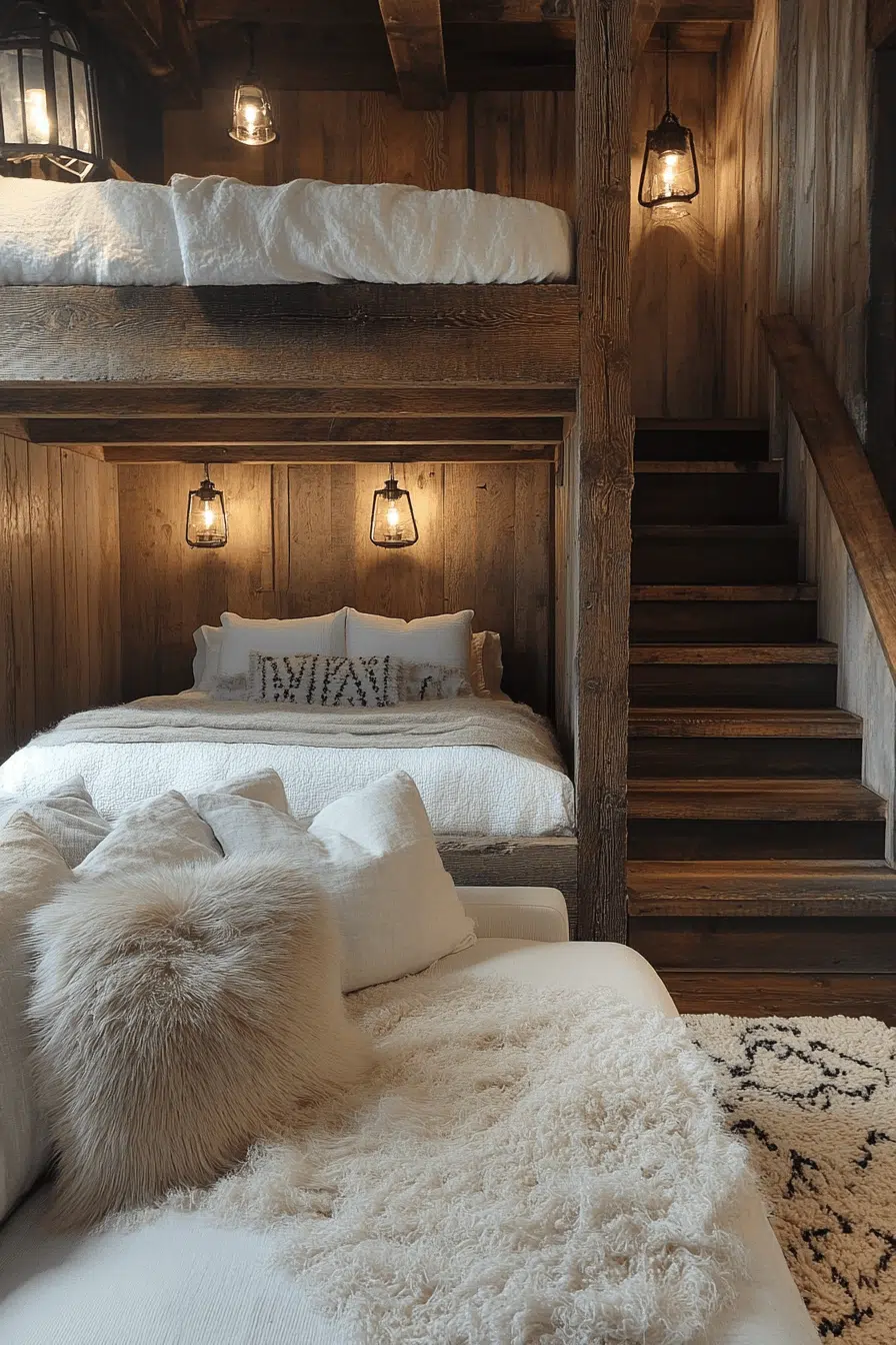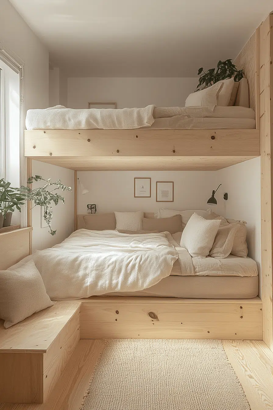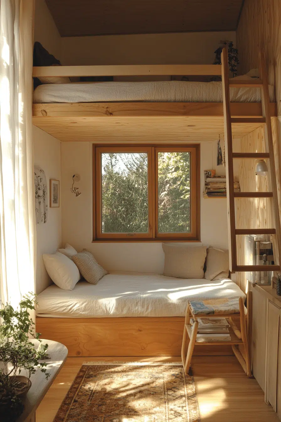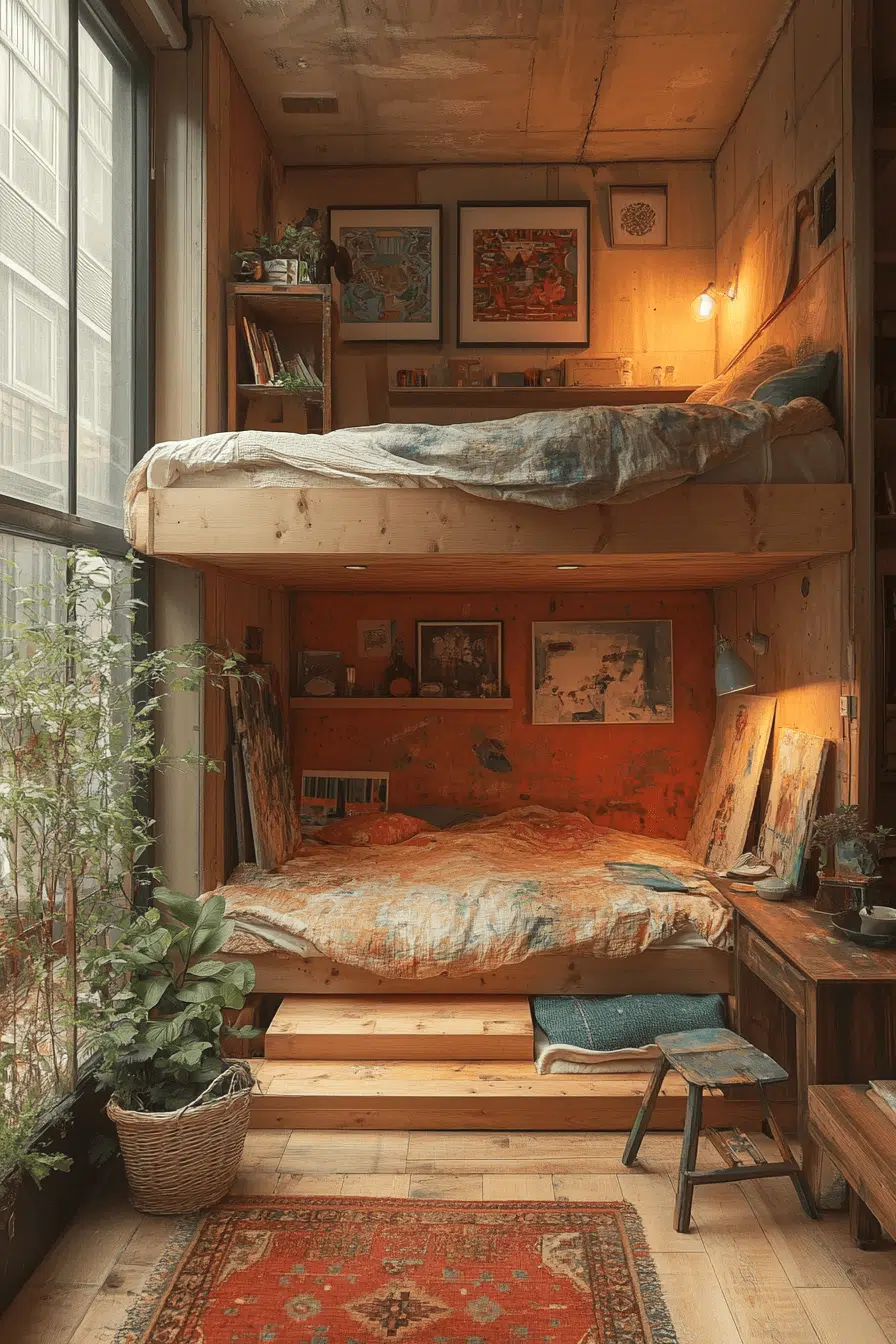 Warm wood loft beds for small rooms bring rustic comfort. Natural textures soften the space visually. The area beneath becomes functional storage or seating. This style feels cozy without feeling heavy. It’s great for nature-inspired interiors.