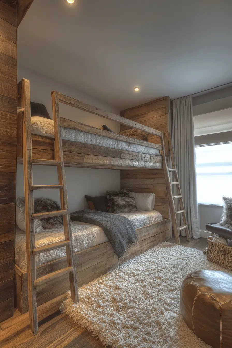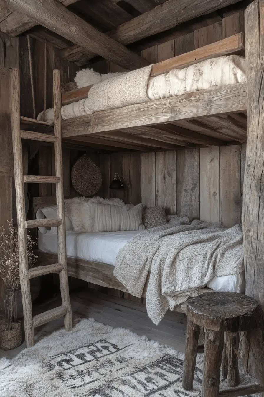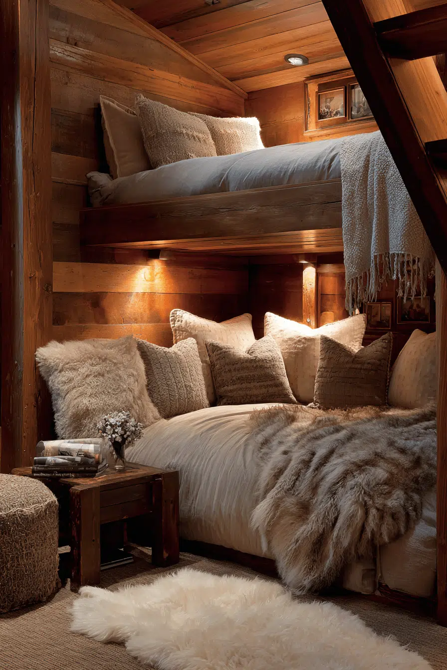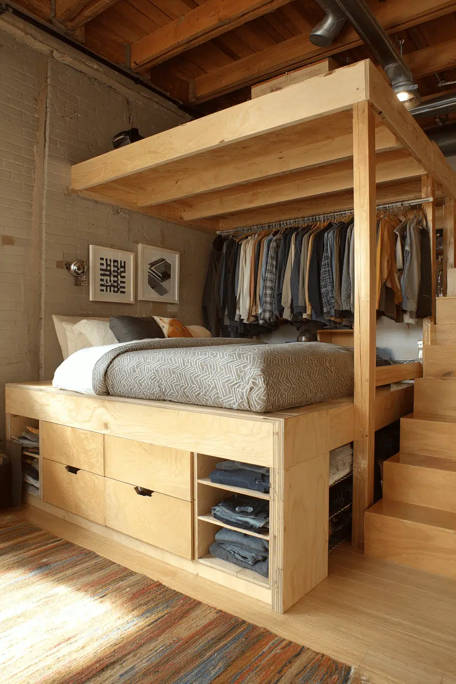 Warm wood loft beds for small rooms bring rustic comfort. Natural textures soften the space visually. The area beneath becomes functional storage or seating. This style feels cozy without feeling heavy. It’s great for nature-inspired interiors.