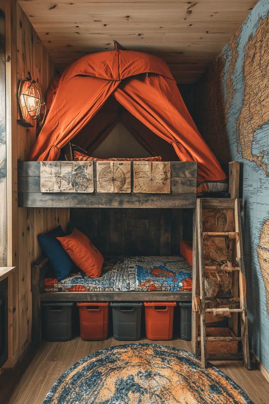 Adventure-inspired loft beds for small rooms encourage play and imagination. Themed elements turn the bed into more than just a sleeping spot. Underneath, space is used creatively for activity or storage. Durable construction keeps everything safe and sturdy. These beds grow with kids while saving space.