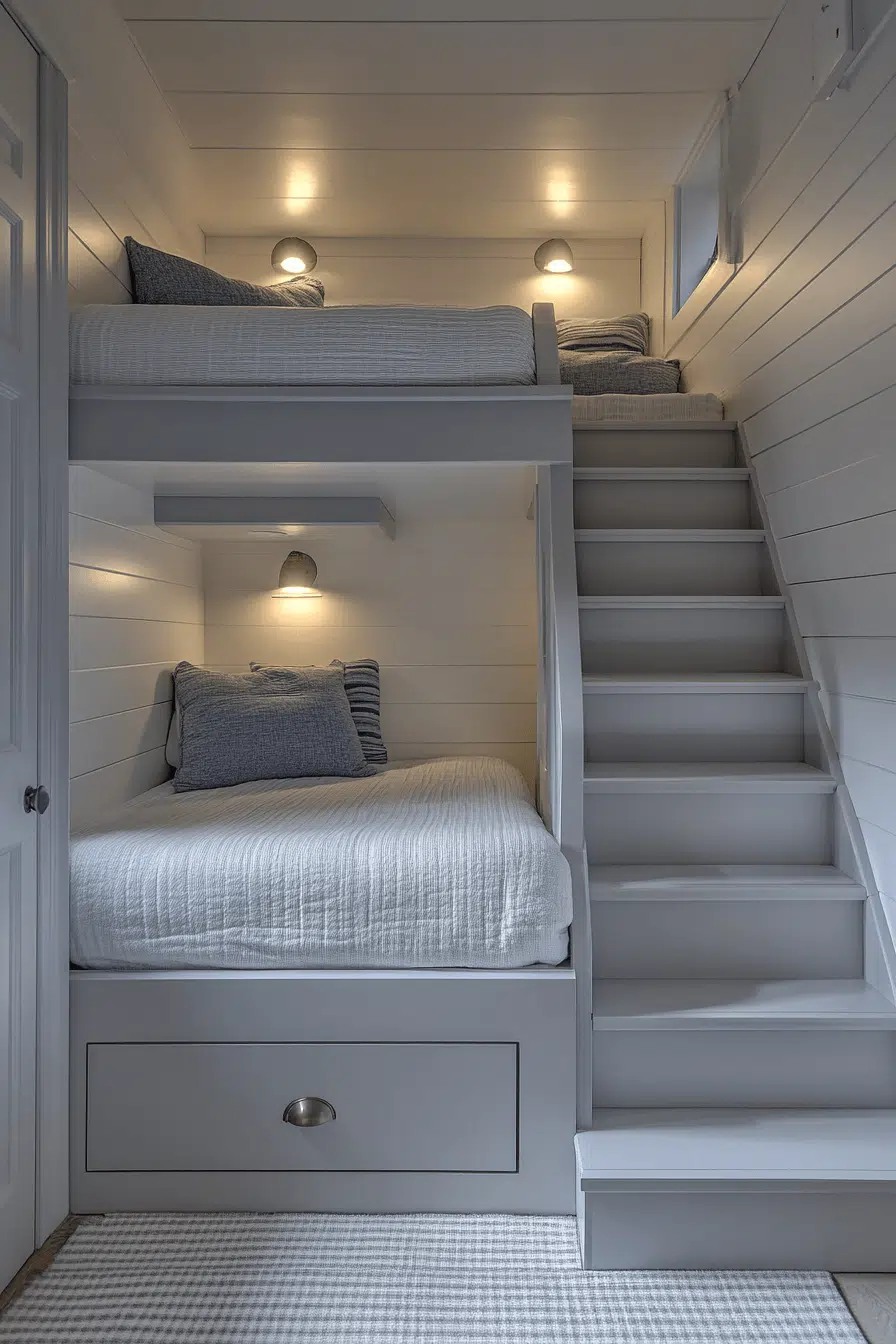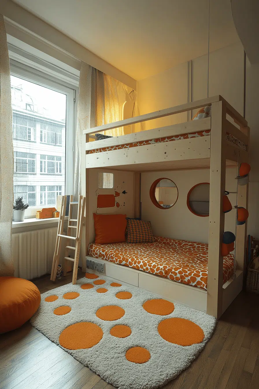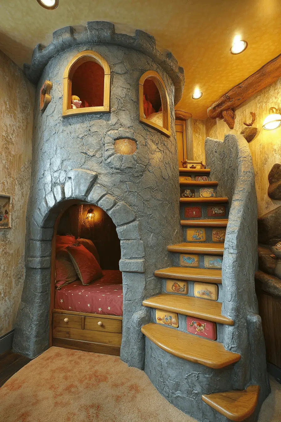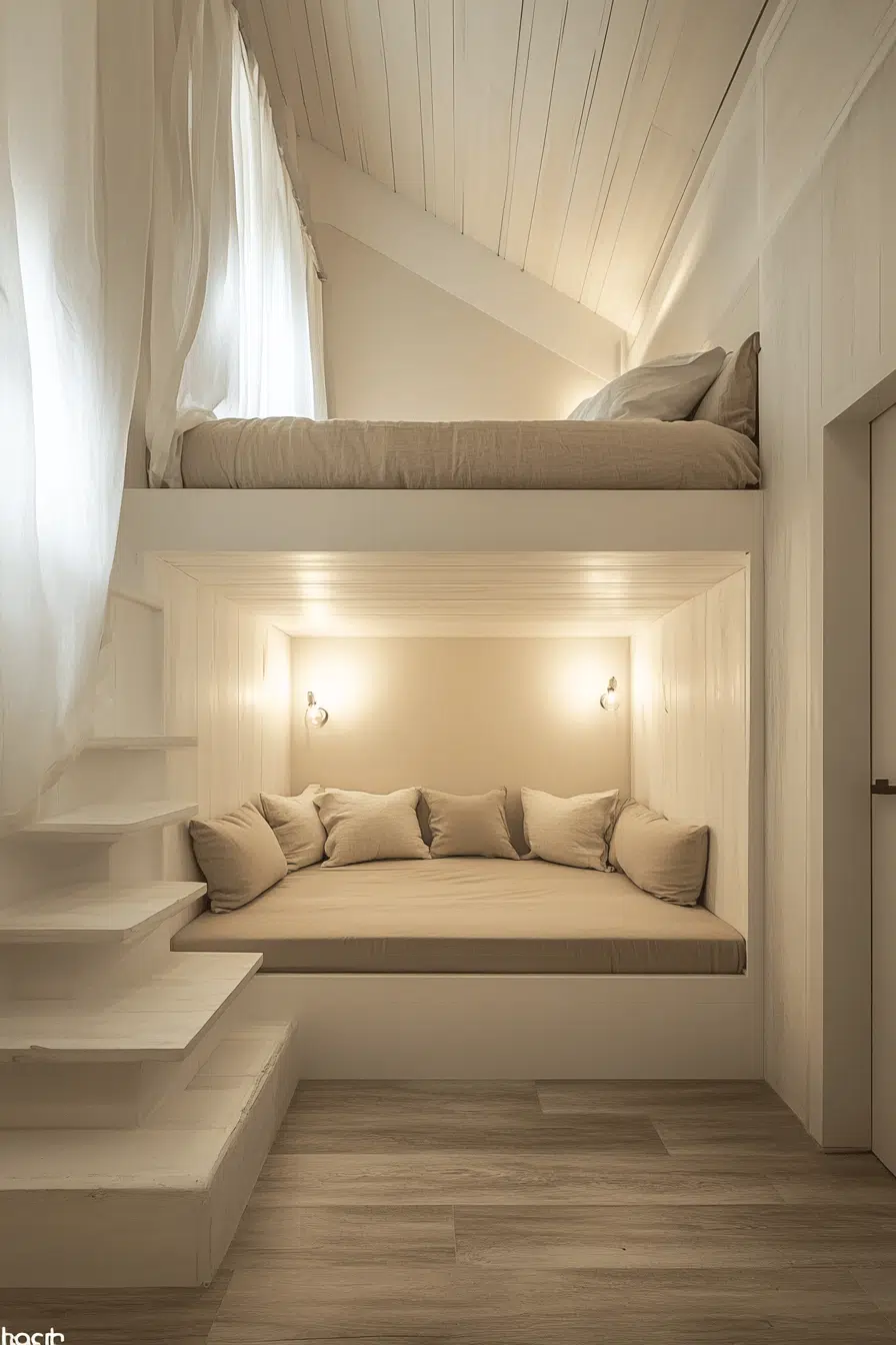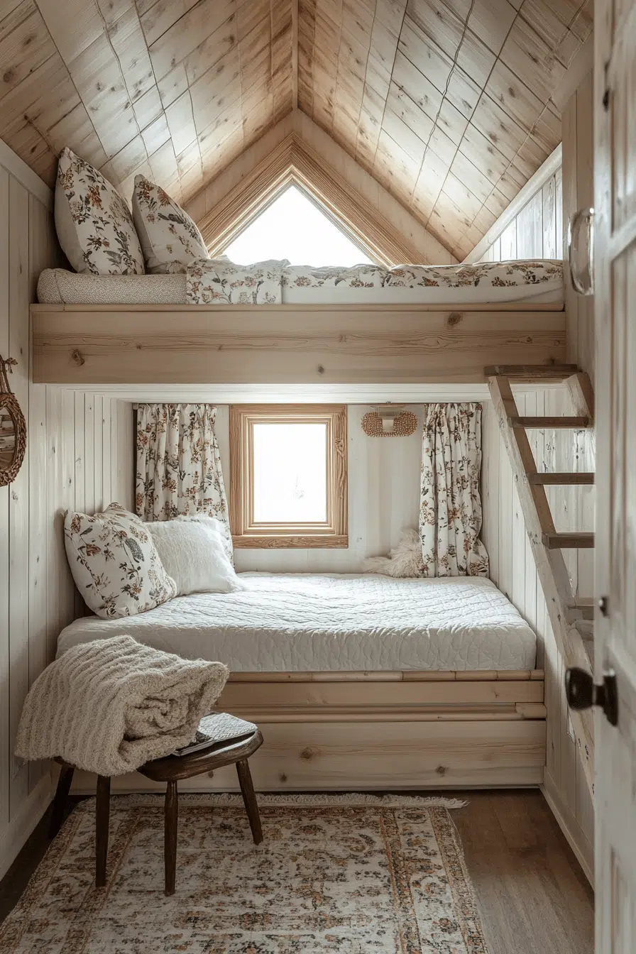 Storybook-inspired loft beds for small rooms add charm while saving space. Decorative details and warm materials create a cozy, welcoming atmosphere. The area below becomes a perfect reading nook or play space. This layout blends personality with function beautifully. Small rooms feel magical instead of cramped.