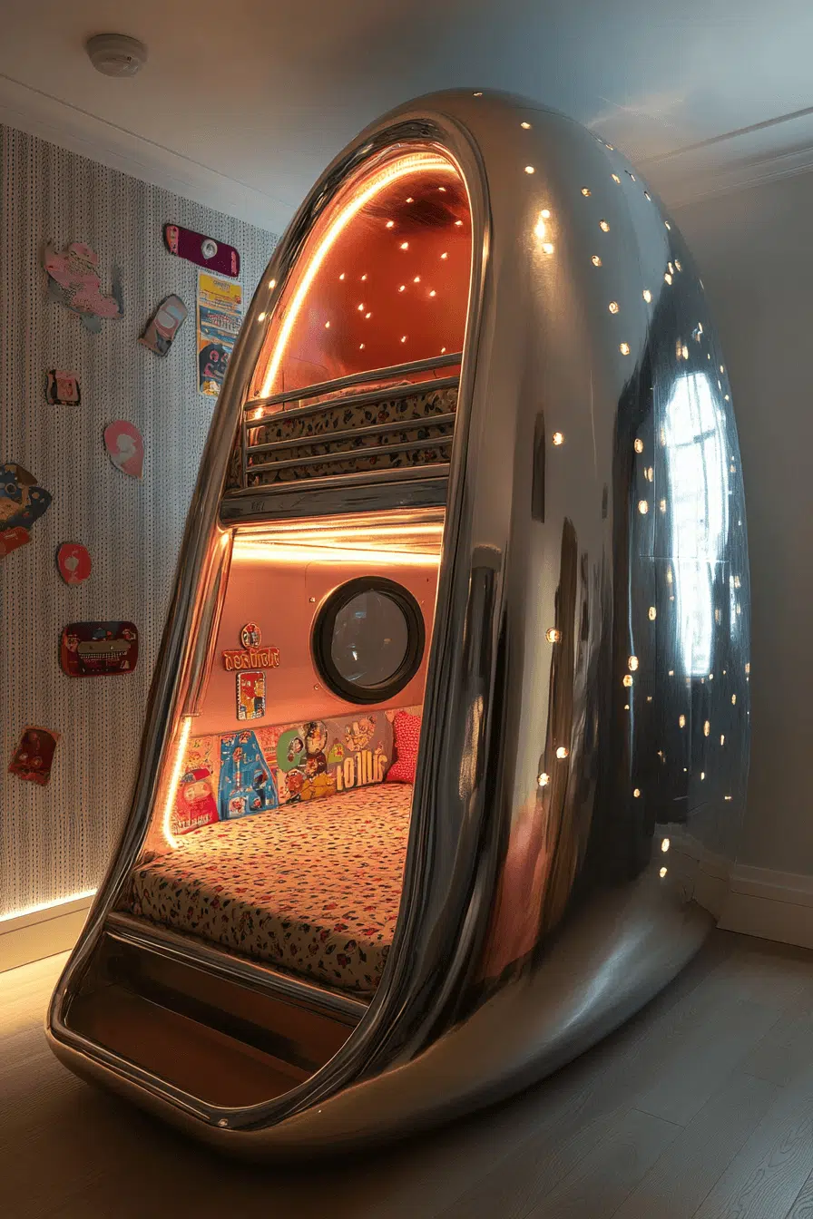 Futuristic loft beds for small rooms introduce bold personality. Enclosed designs and ambient lighting create a capsule-like experience. The compact footprint fits beautifully in tight spaces. These beds feel innovative and fun. Perfect for anyone who loves standout design.