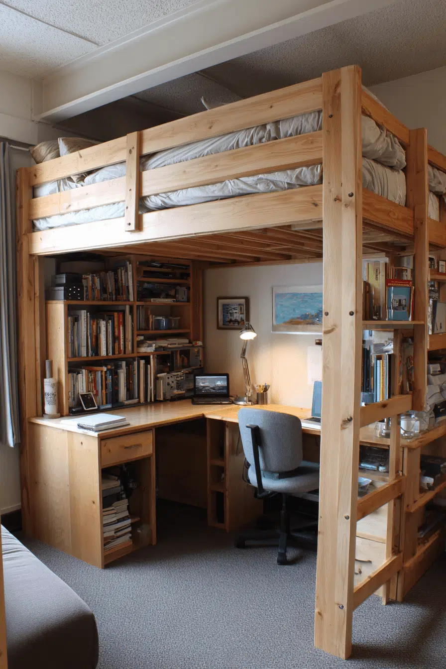 Study-ready loft beds for small rooms help maintain focus and structure. Built-in desks and shelving create dedicated work zones. Lifting the bed frees valuable floor space. The room feels organized and intentional. It’s an ideal setup for students or remote workers.