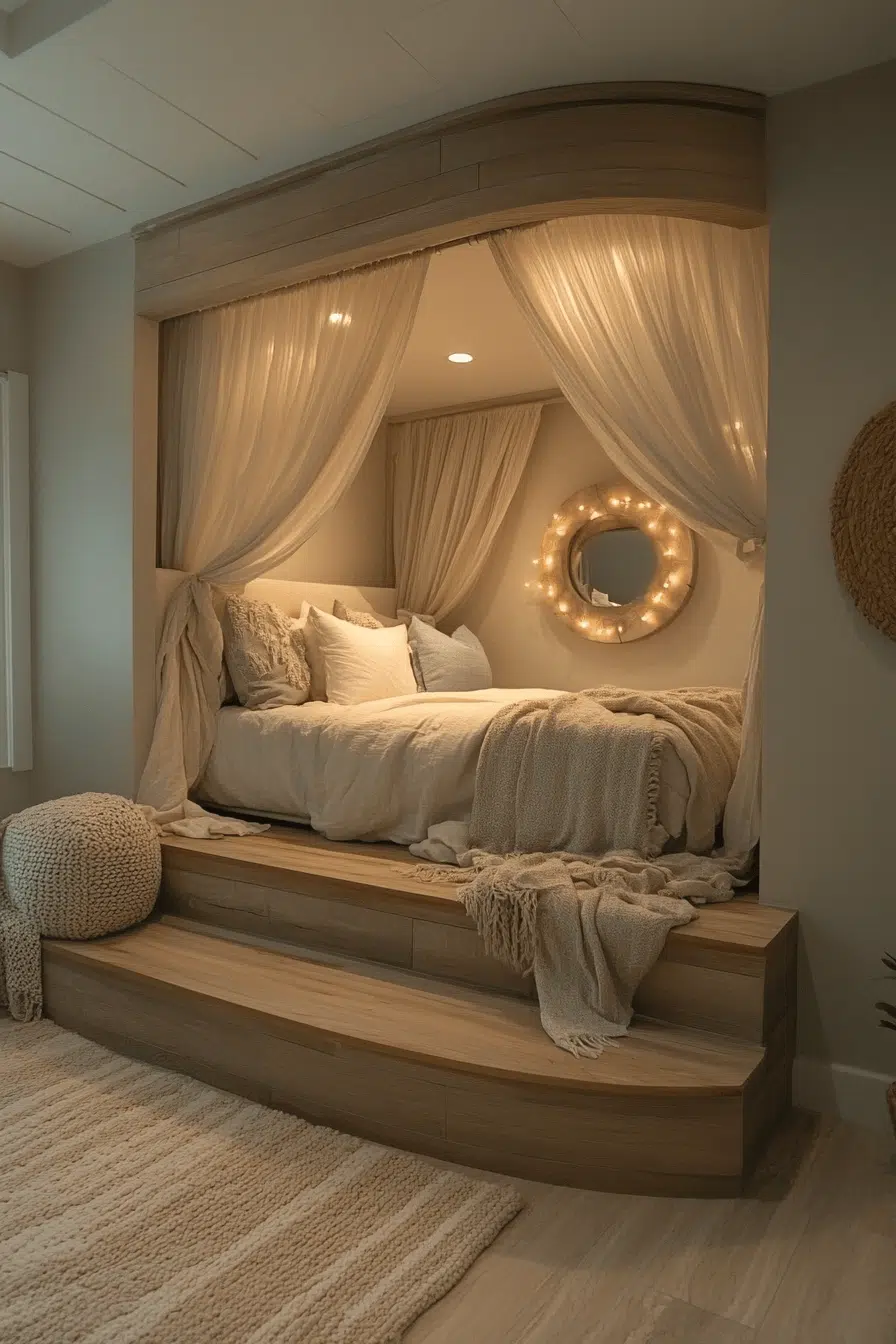 Canopy-style loft beds for small rooms add softness and romance. Draped fabric creates an intimate sleeping space above. The lower area remains functional and uncluttered. This design adds elegance without bulk. It’s a beautiful way to elevate compact bedrooms.