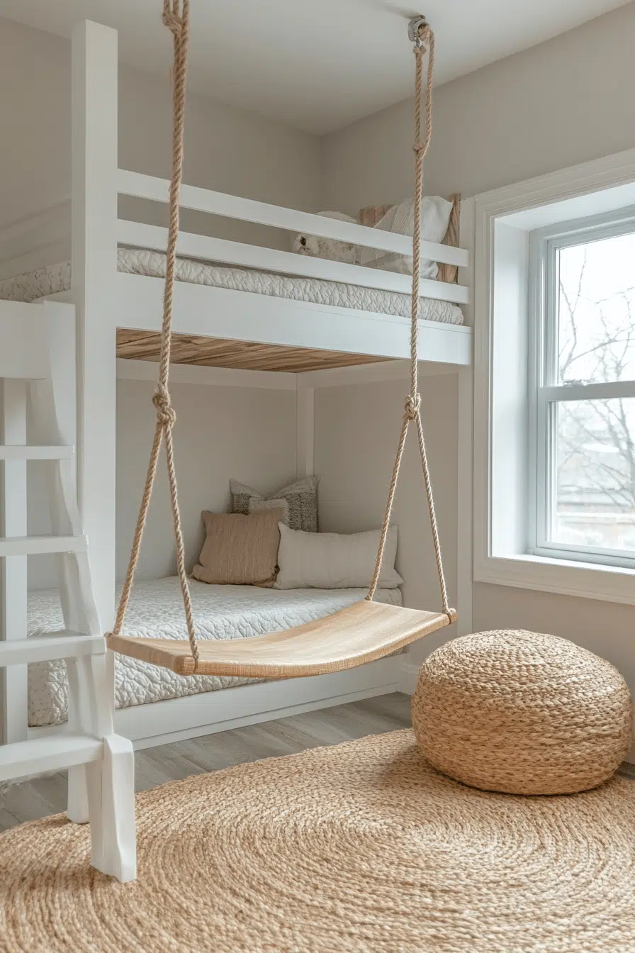 Loft beds for small rooms with suspended seating add a whimsical touch. Hanging chairs create a relaxing nook beneath the bed. The layout feels creative and joyful. Space stays open and flexible. It’s a standout design for expressive interiors.
