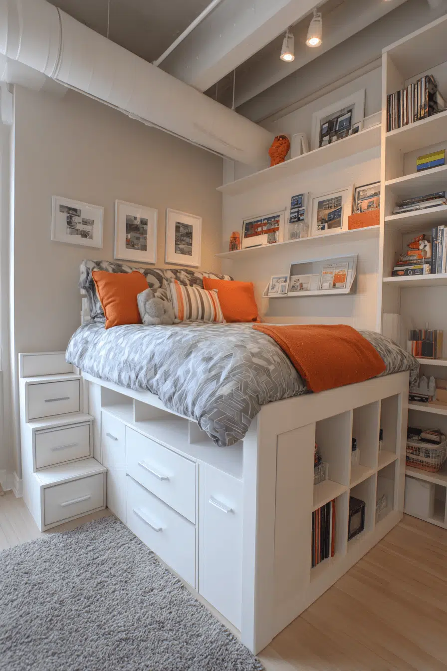 Loft beds for small rooms with built-in libraries create cozy escapes. Shelving beneath keeps books beautifully organized. A comfortable seat completes the reading zone. The elevated bed maintains separation and calm. It’s a dream setup for readers.