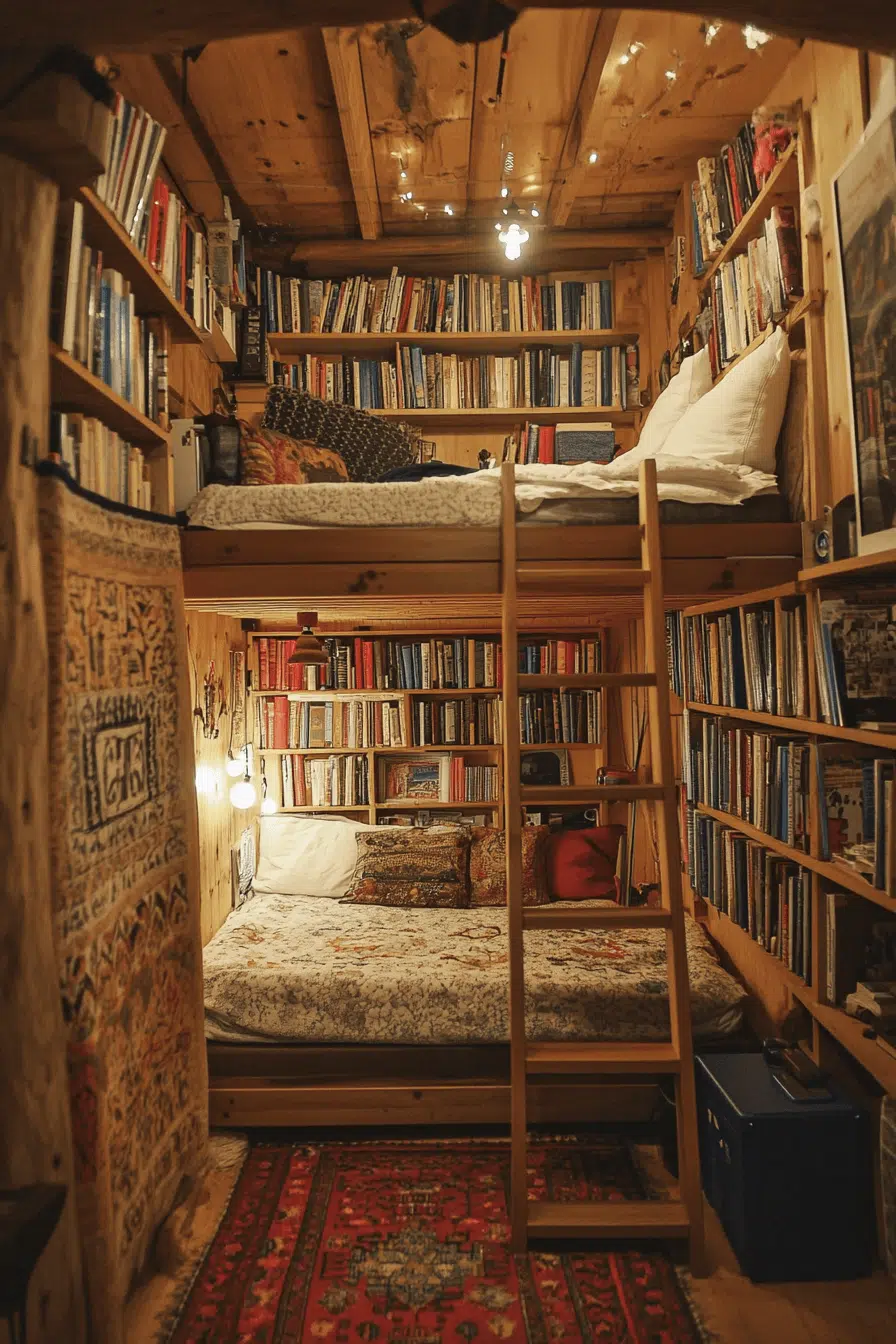 Book lovers thrive with loft beds for small rooms that incorporate reading zones. Shelves built into the structure keep favorite titles close at hand. The lower area becomes a peaceful reading retreat. This design celebrates both comfort and personality. It’s perfect for readers short on space but big on style.