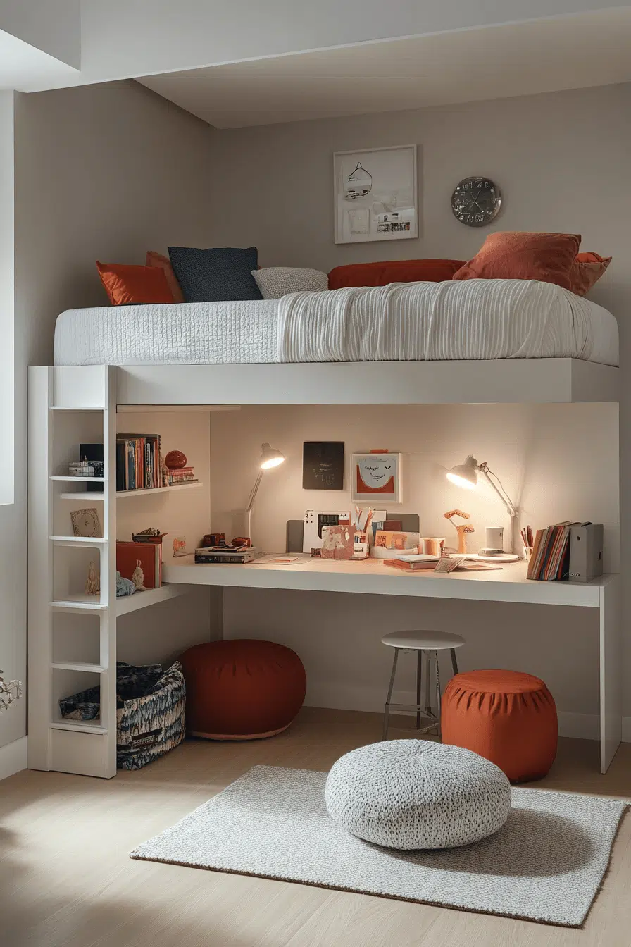 Creative loft beds for small rooms support productivity without sacrificing sleep. The raised bed separates rest from work zones below. Built-in desks and shelves keep projects organized. Lighting is thoughtfully placed for focus and inspiration. It’s a smart solution for creatives in compact homes.