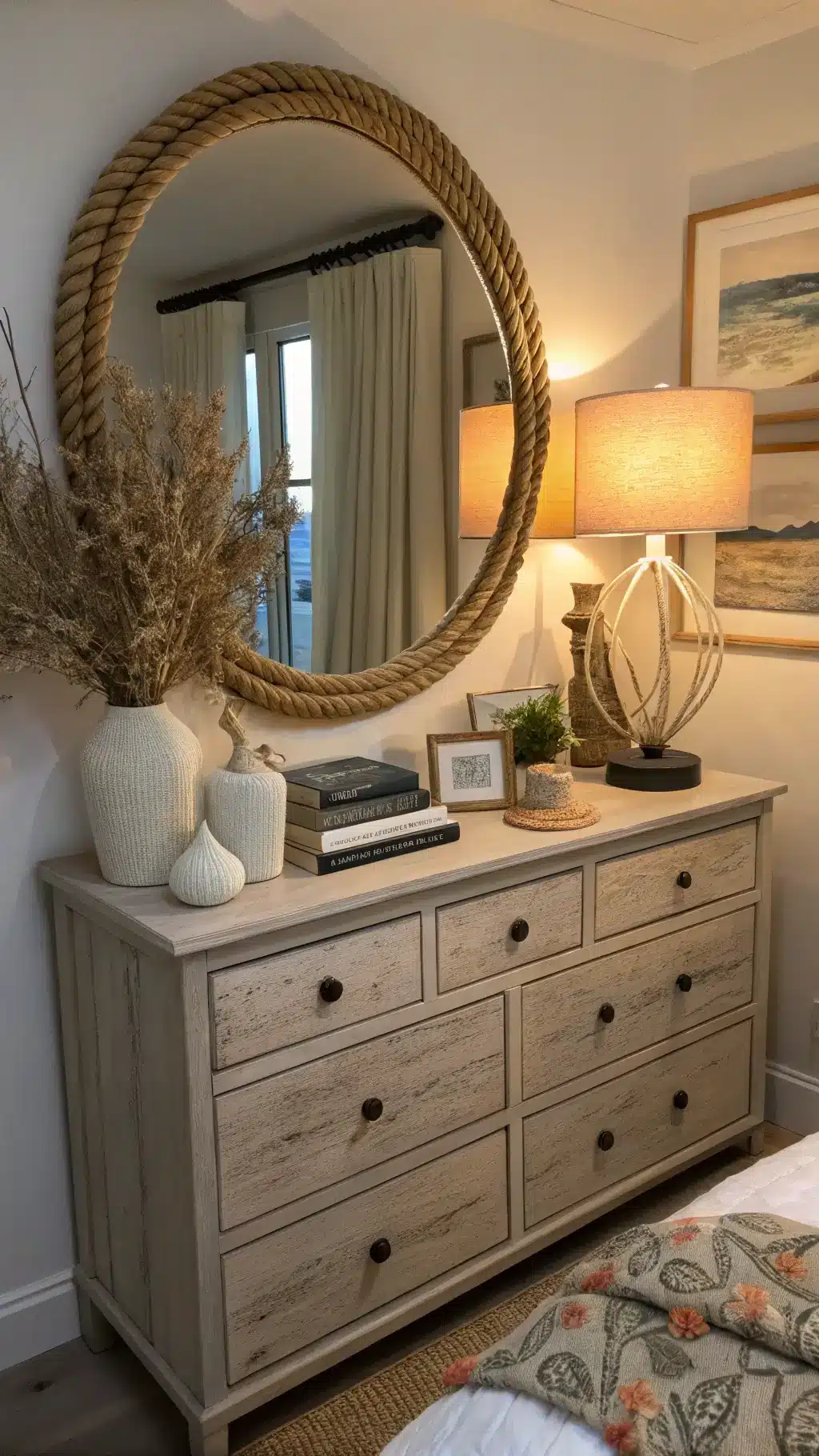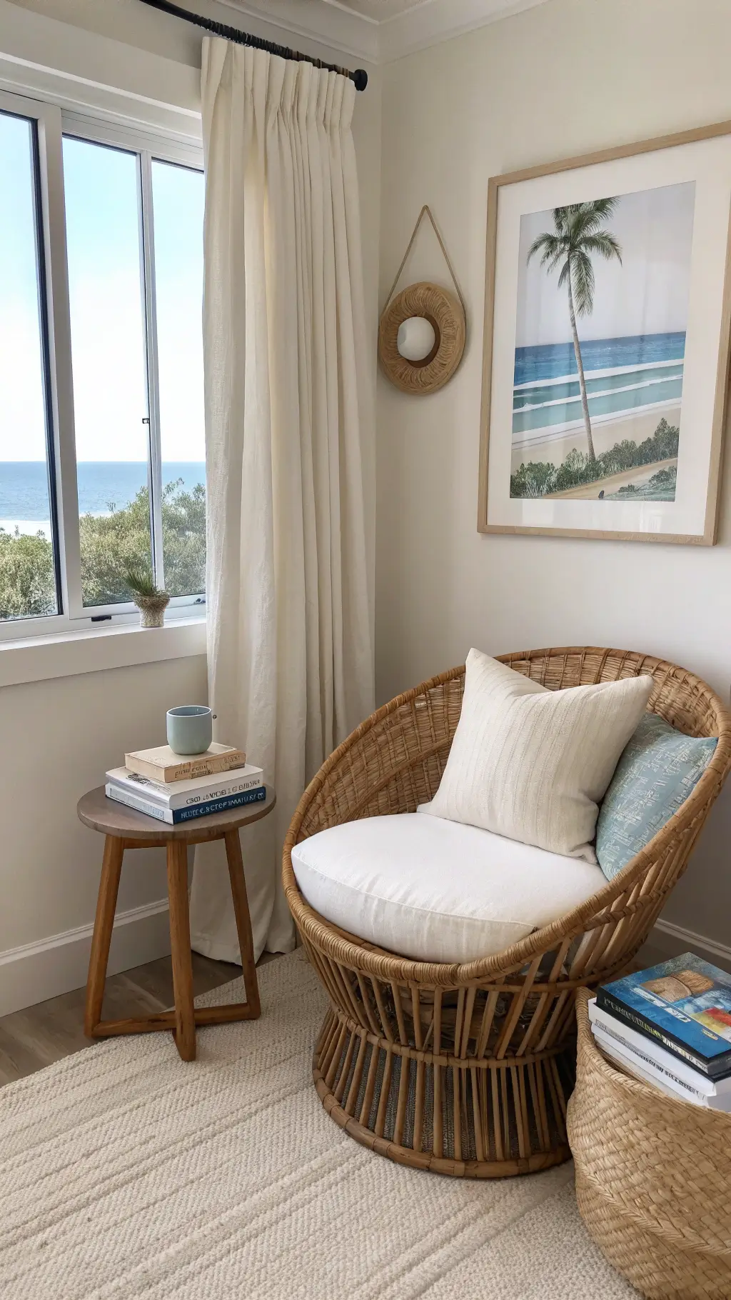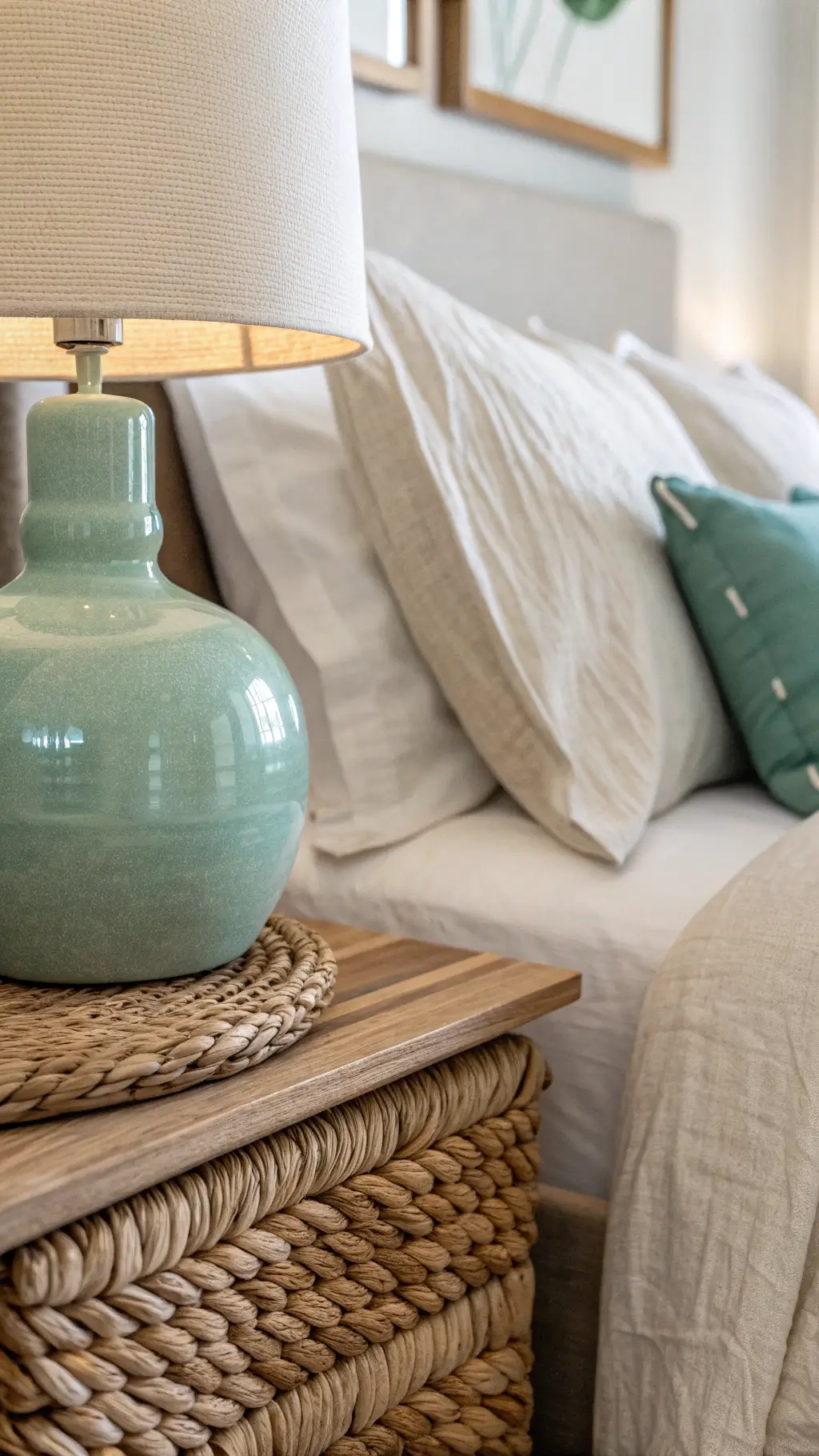 - The materials: Light woods like pine or driftwood-finished pieces, rattan, jute, cotton, linen, and woven textures