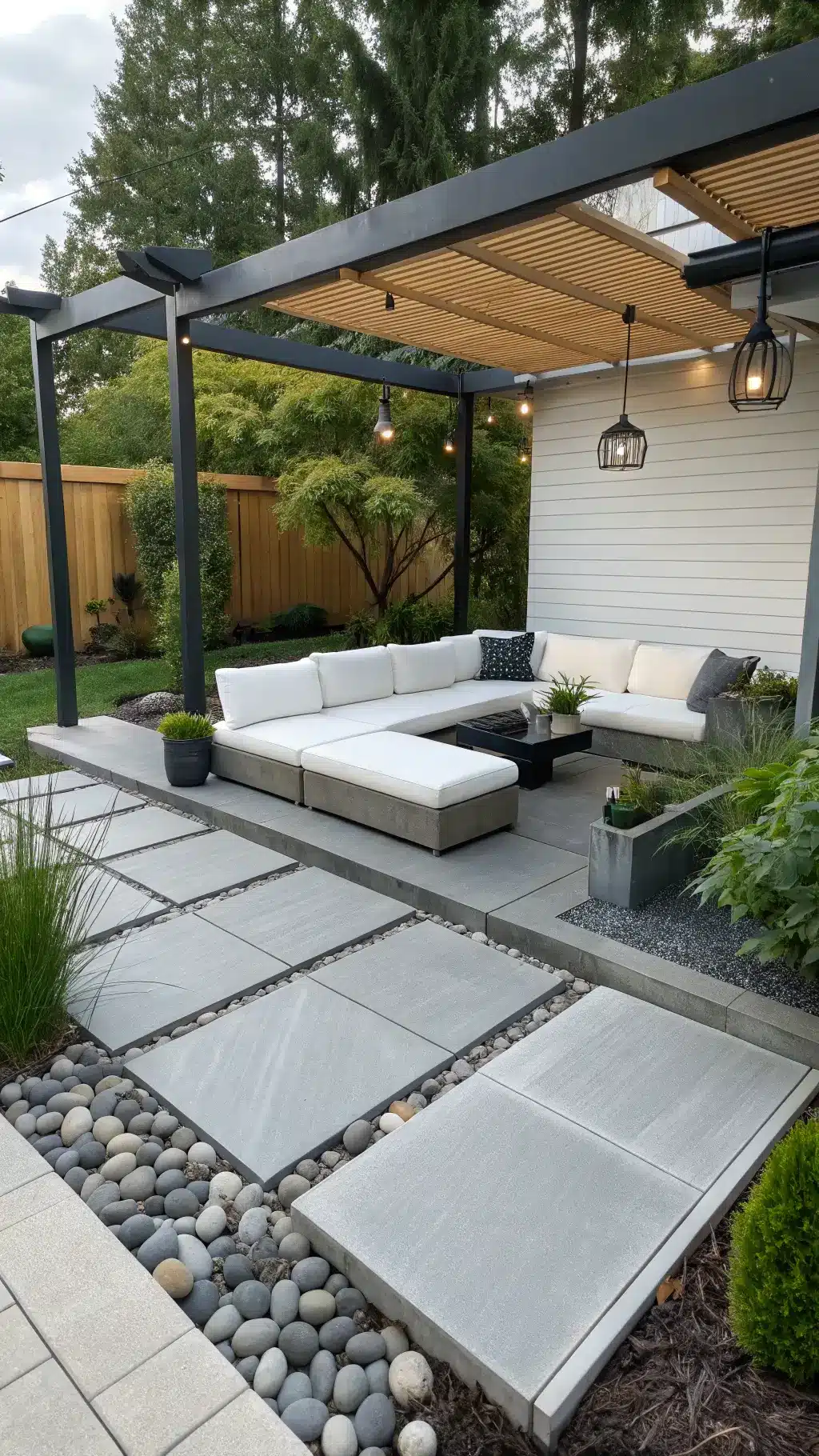 Gravel lounge area, stepping stone path, deck tile overlay—simple and renter-friendly options.