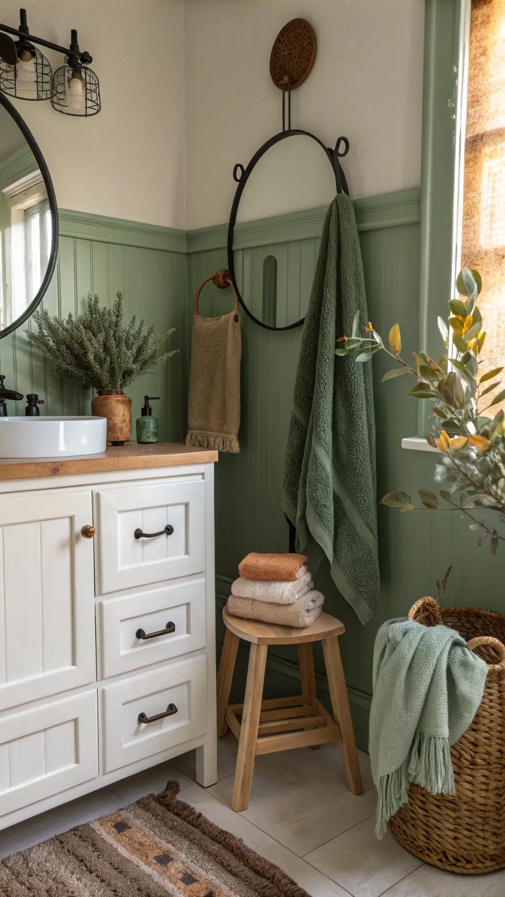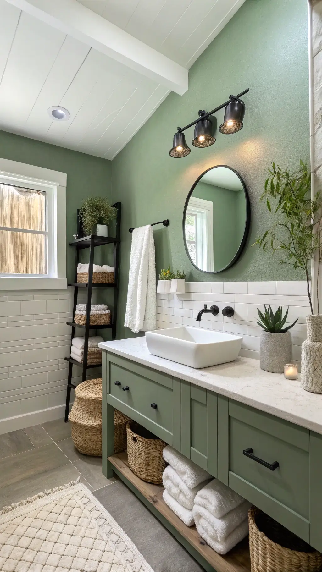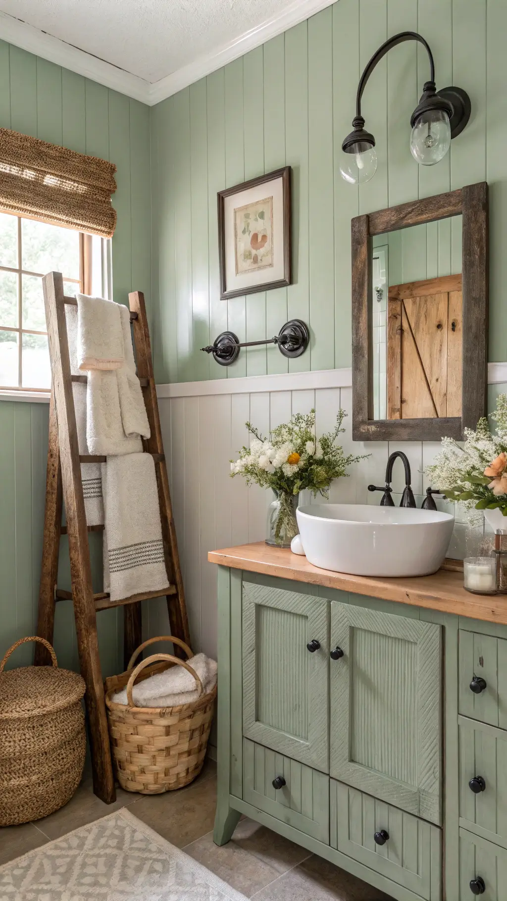 Sage green walls are the easiest starting point. One gallon covered my small bathroom twice with plenty leftover.