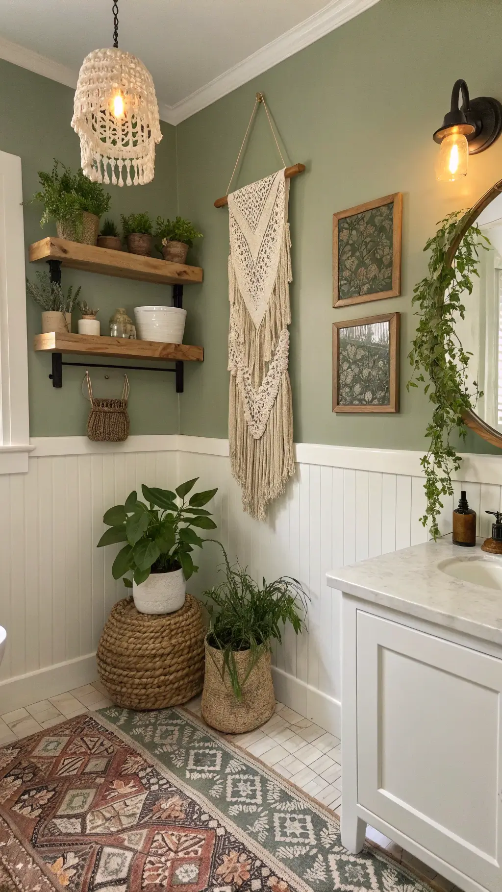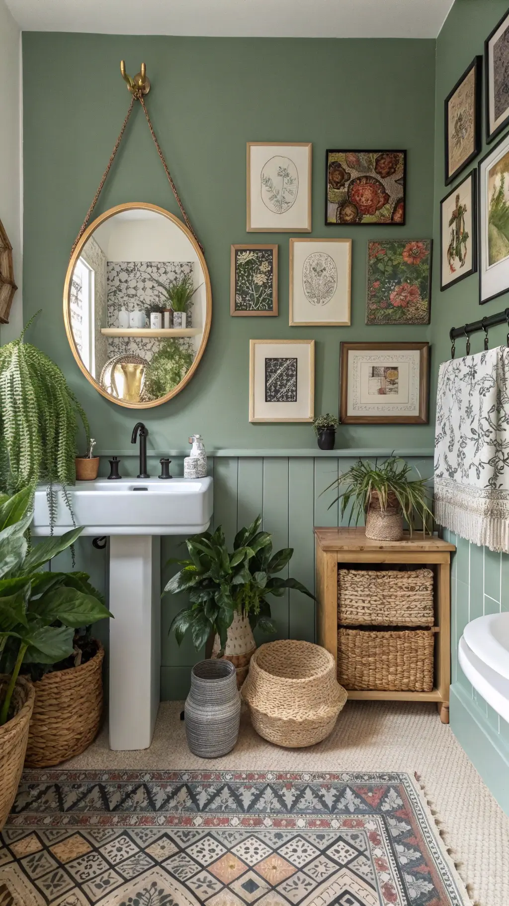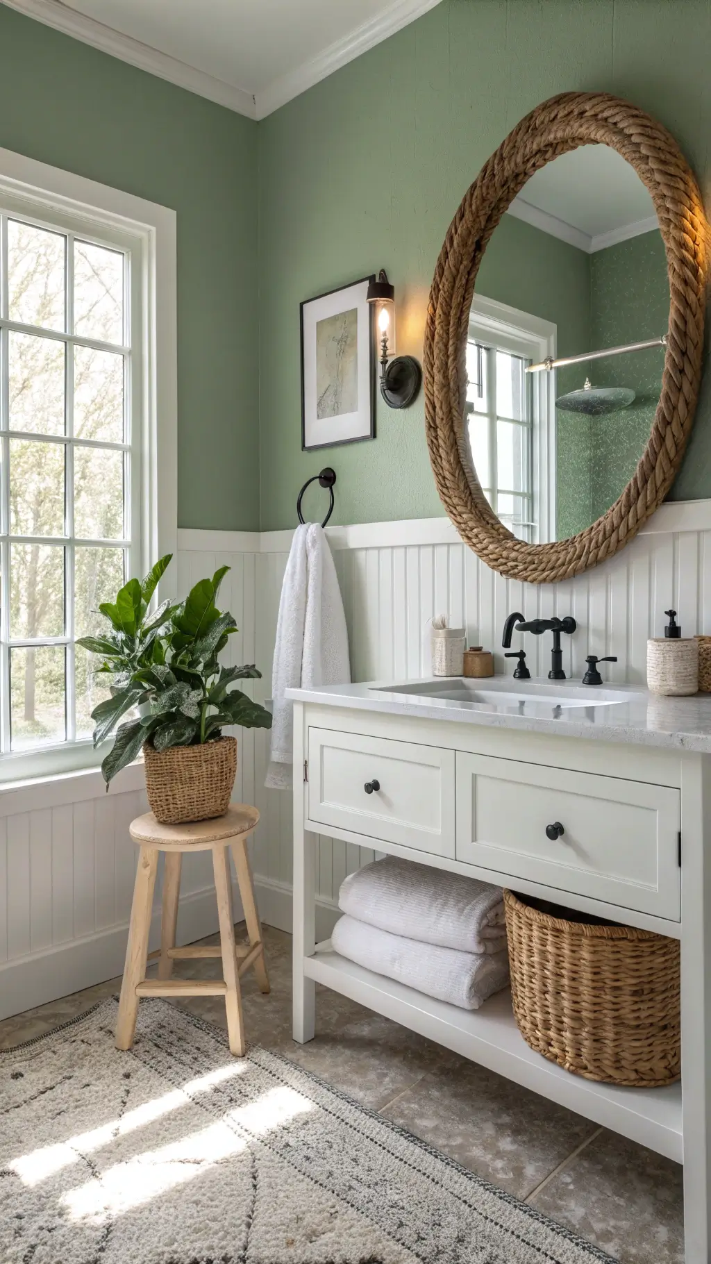 Sage green walls are the easiest starting point. One gallon covered my small bathroom twice with plenty leftover.