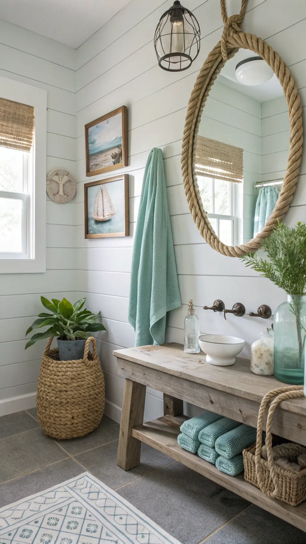 Coastal Vibes: Rope accents, sea glass towels, nautical art.