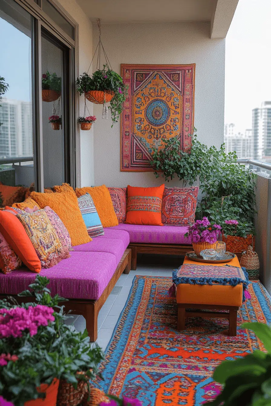 Color and creativity instantly energize a balcony with layered textiles and expressive accents. These playful small apartment balcony ideas shine when bold patterns, cozy floor seating, and warm lighting come together. Throw pillows and textured rugs soften the space while keeping it flexible. Lanterns or string lights bring nighttime charm without overwhelming the layout. Multi-use furniture keeps everything practical and adaptable.