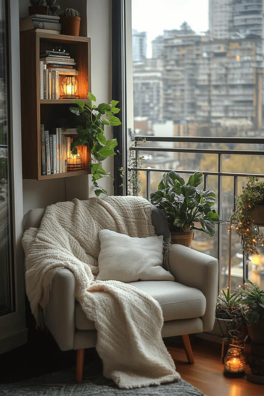 A quiet reading corner transforms a balcony into a personal retreat. Among cozy small apartment balcony ideas, plush seating and layered textiles set the tone. Slim shelves or carts keep books close without clutter. Fragrant plants enhance the sensory experience. Soft lighting supports long reading sessions.