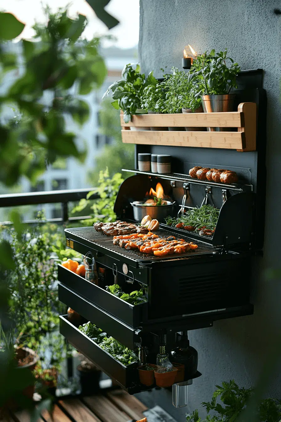 Compact grilling setups make outdoor cooking possible even in small spaces. Functional small apartment balcony ideas use electric grills and fold-down prep tables. Rail-mounted herb planters keep flavors close at hand. Smart layout choices maintain safety and comfort. Cooking outdoors becomes easy and enjoyable.