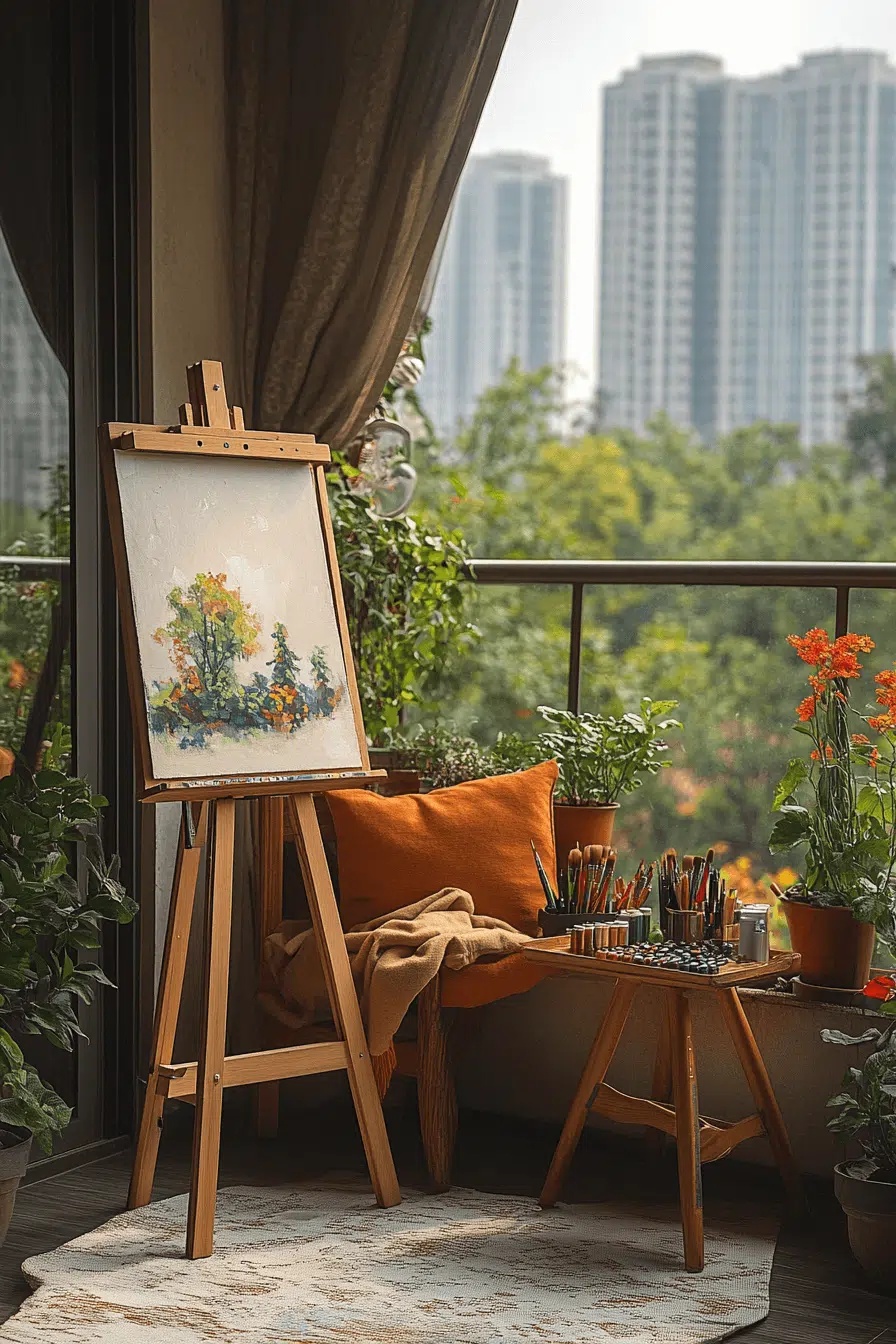 Creative minds thrive in outdoor studios filled with inspiration. Artistic small apartment balcony ideas use compact furniture and expressive decor. Bold fabrics and art pieces spark imagination. Wind chimes or water elements enhance focus. The space encourages flow and creativity.
