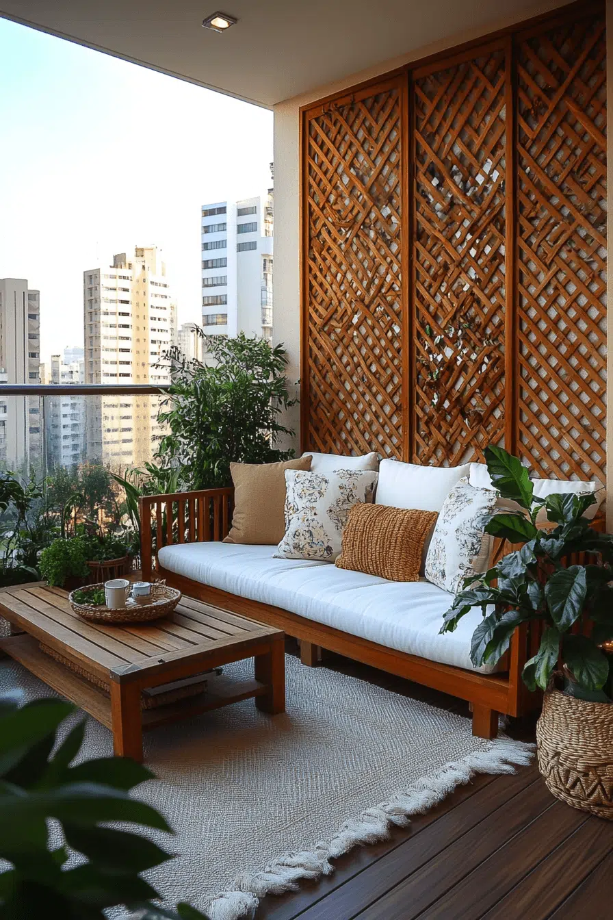 Privacy solutions turn balconies into secluded escapes. Thoughtful small apartment balcony ideas include tall planters, screens, or frosted panels. Greenery softens boundaries naturally. Ambient lighting enhances comfort. The result feels peaceful and personal.