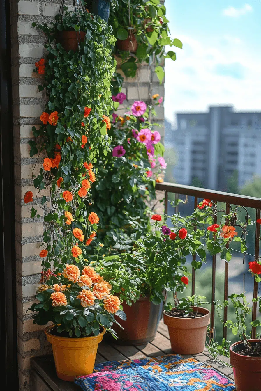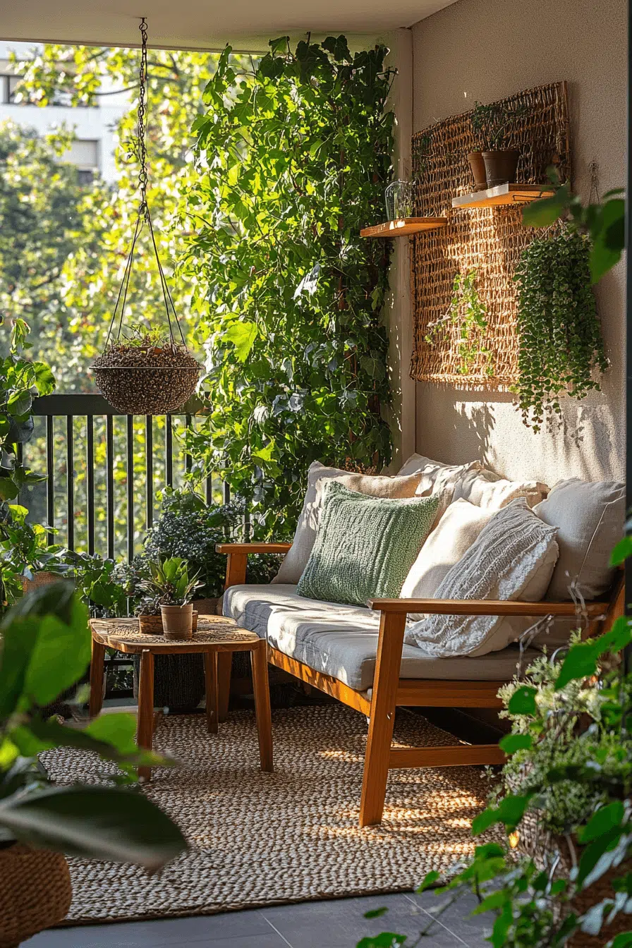 City living feels calmer when your balcony becomes a green escape layered with plants and soft seating. One of the most refreshing small apartment balcony ideas uses vertical greenery to enhance privacy without sacrificing floor space. Hanging planters and climbing vines visually expand the area while creating a cozy enclosure. Cushions and slim outdoor rugs add comfort without clutter. Even a compact tabletop fountain can introduce soothing sound.