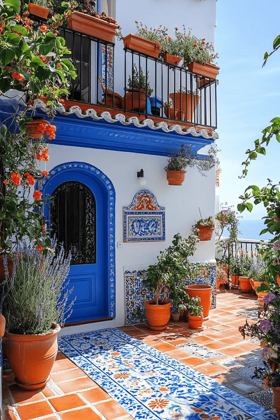 Mediterranean inspiration adds warmth and personality to even the smallest balcony. These sun-kissed small apartment balcony ideas rely on terracotta tones, soft blues, and textured finishes. Decorative tiles and iron details bring old-world charm. Climbing plants create shade and movement. The atmosphere feels breezy and joyful.