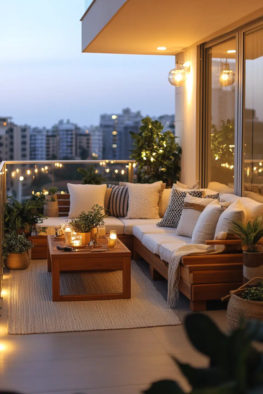Relaxation comes naturally in balconies designed for lounging. Comfortable small apartment balcony ideas feature plush cushions and layered textiles. Low-profile furniture enhances comfort without crowding. Soft lighting completes the scene. This space invites rest anytime.