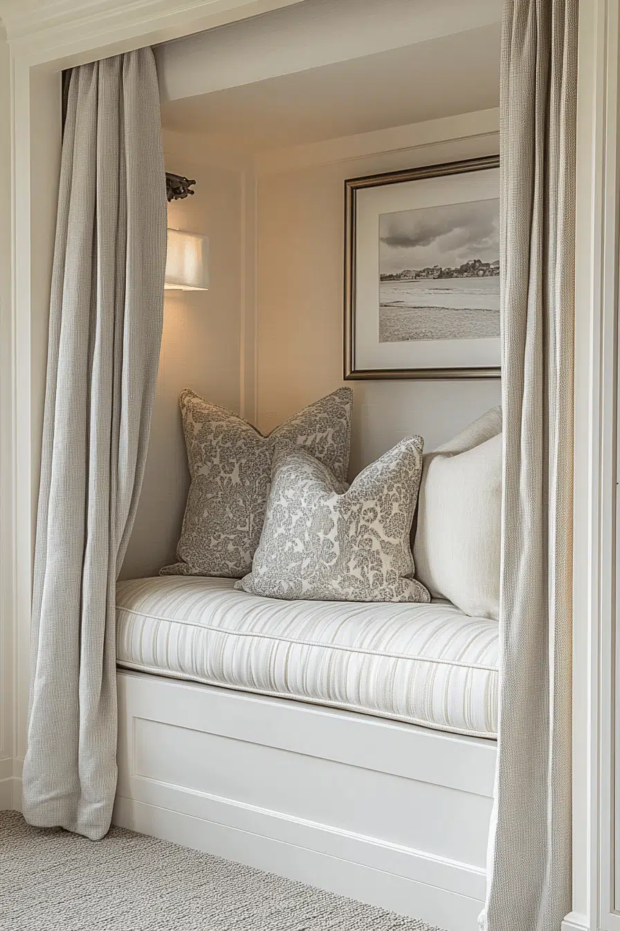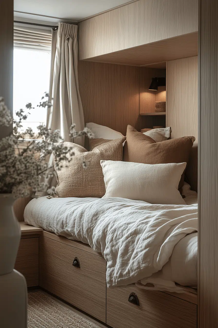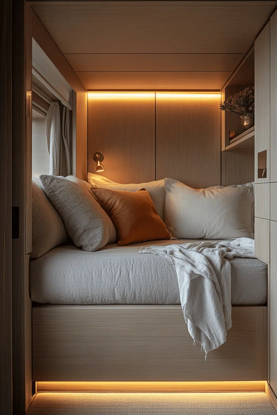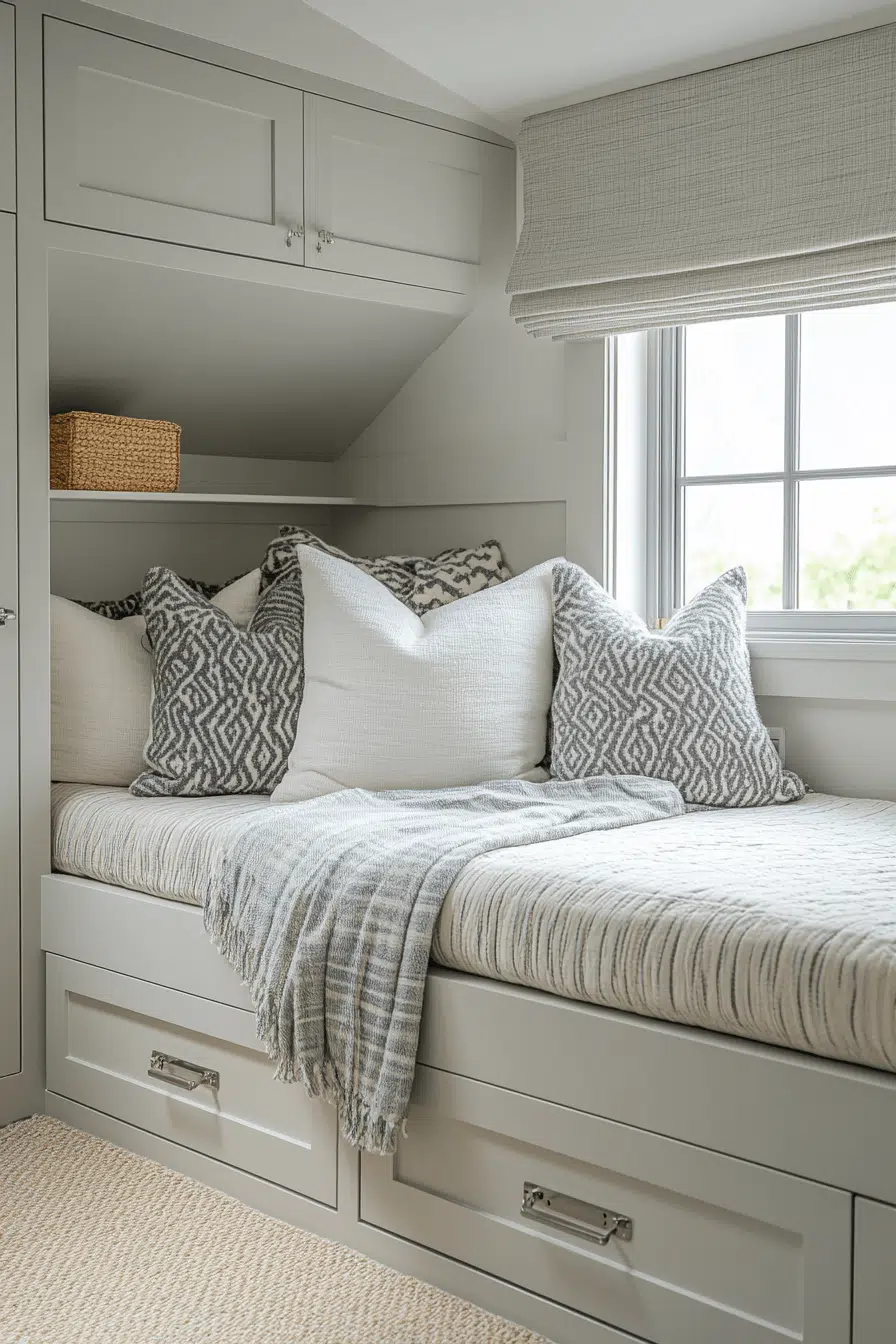 Cozy sleeping nooks add charm and comfort to unique small guest room ideas. Tucked-away beds paired with soft lighting create a welcoming, intimate retreat. Small guest room ideas shine when warm textures and neutral tones are layered for balance. Keeping decor minimal prevents the space from feeling crowded. The result is a peaceful and inviting atmosphere guests will love. Try small guest room ideas that turn small spaces into dreamy hideaways!