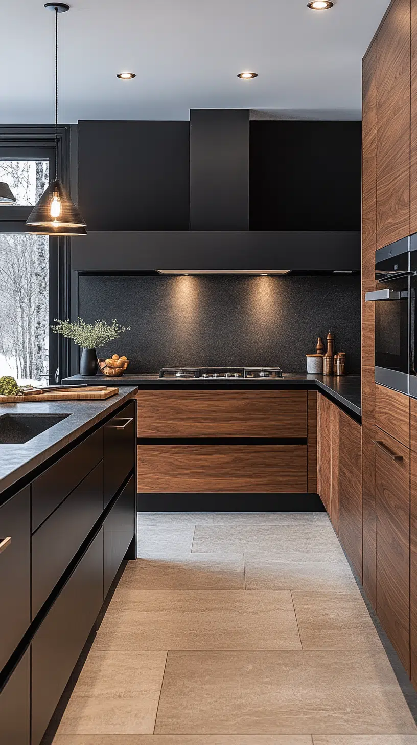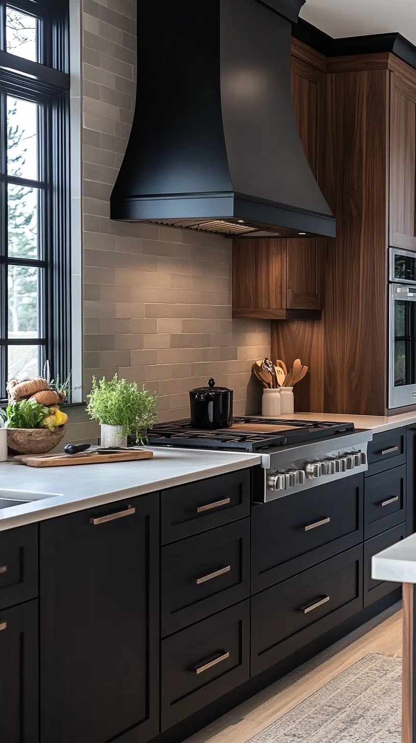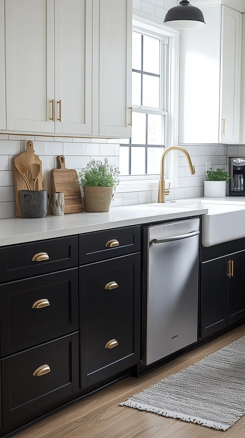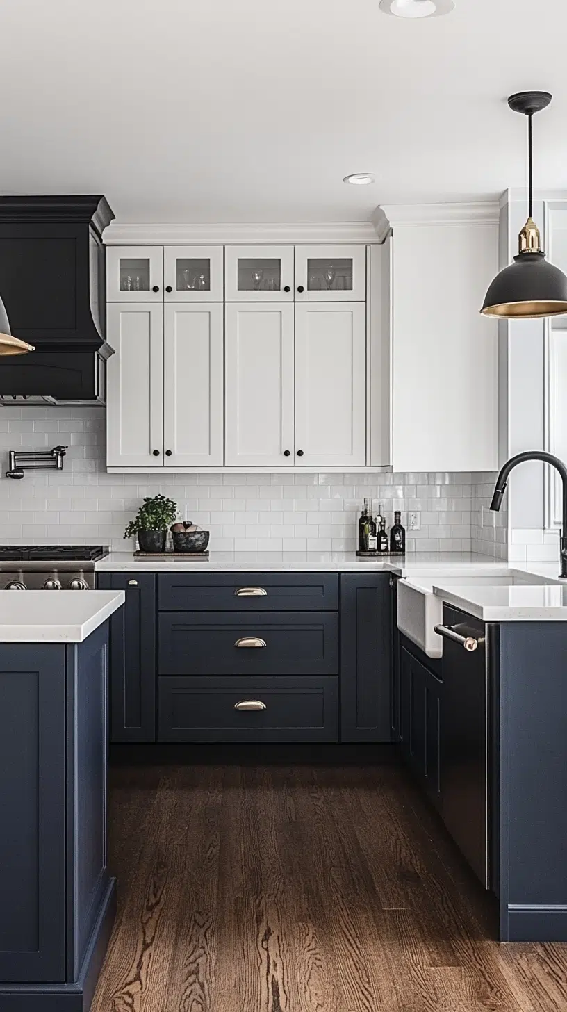 - Dramatic Contrast: Matte black lowers + warm white uppers